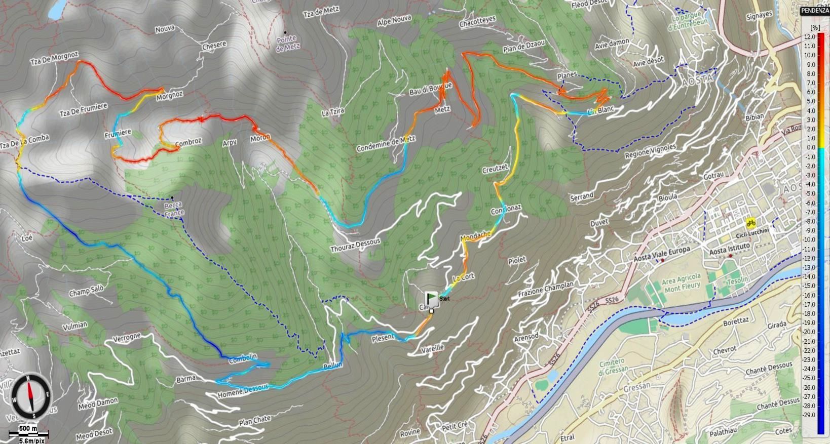 Un giro per mountain bike non particolarmente impegnativo tra gli alpeggi situati nella parte centrale della Val d’Aosta che sfrutta in salita le molteplici poderali a servizio degli stessi per compiere un ampio anello intorno ad un modesto rilievo locale chiamato Becca France. Gli ampi panorami offerti nonché la lunga e divertente discesa su filante sentiero fanno sì che l’itinerario risulti alla fine decisamente piacevole e meritevole di interesse. Si parte, già in quota rispetto al fondovalle, da una piccola frazione di Sarre, Caillod, posta a poco più di 1.200 metri su una bellissima balconata sulla valle centrale e si procede verso est lungo il panoramico asfalto della Strada Regionale numero 41 dei Salassi per poco più di 4,4 km; la traccia GPS devia poi sulla sinistra su una secondaria in asfalto sul cui muretto di cinta, in pietra, nei pressi dell’incrocio è riportata a mano l’indicazione per Metz. Qui ha inizio il primo tratto di ascesa di giornata seguendo la bella strada divenuta quasi subito poderale a fondo sterrato che risale in direzione del citato alpeggio con pendenze mai impegnative; dopo circa 5,3 km si giunge in prossimità dell’Alpe a quota 1.738 metri ed evitando di entrarvi (cartello segnaletico) si prosegue in salita per altri 800 metri circa sino Alpe di Vignon (quota 1.820) dove si incontra una biforcazione: tenendo ora la sinistra (a destra deviazione in salita per Punta Chaligne) la strada perde circa 130 metri di quota andando a incrociare lo sterrato proveniente da Thouraz. Ora si riparte per il successivo tratto di ascesa verso gli alpeggi superiori: la poderale, su discreto fondo, transita in salita dagli alpeggi di Moron (1.780), Combroz (1.950) e La Combaz (2.080), scende leggermente verso l’alpeggio di Frumiere (2.060) per risaliere a Le Morgnoz (2.100) e da qui un ultimo tratto in più decisa ascesa porta nei pascoli dell’alpe Tsa della Comba (2.267) dove termina la traccia stradale. Dall’Alpe si stacca il sentiero che scollina e che conduce in direzione della Becca France: per evitare i cani presenti presso l’alpeggio ci è stato consigliato dai locali di scollinare poco prima andando ad intercettare quasi subito l’evidente sentiero proveniente dall’Alpe. Il sentiero viene percorso per qualche centinaio di metri evitando alcune deviazioni segnalate per la Becca fin tanto che, nei pressi della panoramica balconata con vista fondovalle-Grivola-Rutor, la traccia devia decisa a sinistra in discesa; inizia cosi’ la discesa su sentiero lungo il versante occidentale della Becca France, con prima parte che presenta alcuni passaggi ostici causa pietre ed ostacoli vari, poi, proseguendo sempre dritto e seguendo strettamente la traccia gps, si entra nel bosco ed il single track si fa molto più scorrevole e veloce (alcuni passaggi su roccia per superare una balza impongono una prudenziale discesa dal mezzo). Dopo circa 4 km di ininterrotta discesa su sentiero si percorre un tratto più scomposto e complicato per giungere a Combellin e da qui una facile sterrata in discesa porta a riprendere l’iniziale S.R. dei Salassi da seguire per poco più di 1,5 km fino al villaggio di Bellun; qui, in prossimità del centro dell’abitato, si incontrano sulla destra le indicazioni del sentiero 9A per Ville-Sur-Sarre: la traccia scende inizialmente tra i prati fiancheggiando alcune isolate abitazioni e poi entra nel bosco. Seguendo sempre le indicazioni del citato sentiero e superata in pochi secondi una scalinata in legno (in salita), ci si porta ai margini dell’abitato di Caillod; ora non resta che percorrere gli ultimi 500 metri in salita su asfalto per arrivare al punto in cui questo bel tour è iniziato