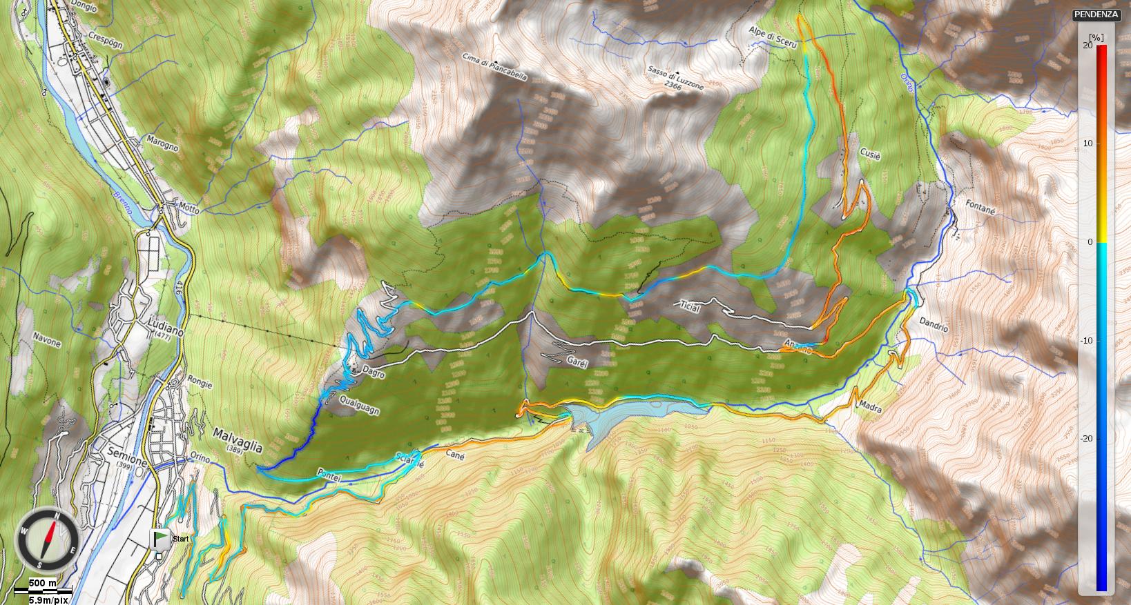 Il Giro si sviluppa nella poco conosciuta Valle Malvaglia, una delle principali laterali della Val di Blenio nel medio Canton Ticino; l’itinerario si presta ad essere affrontato con diverse varianti sia dal punto di vista tecnico che dell’impegno richiesto, potendo contare anche su una filovia meccanizzata che da Malvaglia sale a Dagro. Nell’occasione si è deciso di sfruttare al massimo il dislivello consentito dall’itinerario partendo da fondovalle e sperimentare una buona parte della discesa molto difficile e tecnica che il territorio è in grado di offrire, beneficiando nel complesso di ampi scorci panoramici.
