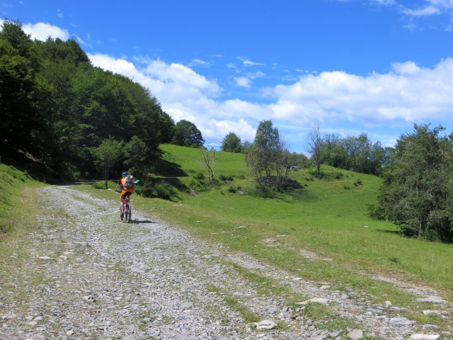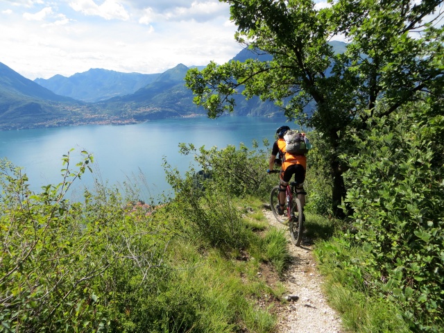 tratto a mano: 20 minuti complessivi, di cui 5 minuti circa per alcuni passaggi su fondo non pedalabile tra Cainallo e Ortanella (sopratutto prima di giungere al Piano di San Pietro aggirando la vetta del Monte Parolo – tratto evitabile se all’Alpe di Esino si scende direttamente sull’asfalto prima di Ortanella seguendo le indicazioni sentieristiche presenti) e circa una 15 di minuti complessivi nella seconda parte di discesa da Ortanella lungo il Sentiero del Viandante  causa passaggi rocciosi non pedalabili
