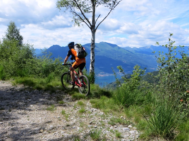 Da Ortanella lungo il Sentiero del ViandanteGiro ad anello all’interno della Val d’Esino, nel Parco Regionale della Grigna Settentrionale, alla scoperta di caratteristici luoghi che circondano la Conca d’Esino. La Grigna ed il Lago di Como, con i suoi due rami, offrono piacevoli spunti paesaggistici lungo un percorso caratterizzato da numerosi saliscendi che richiederà adeguata tecnica sopratutto nella fase discensiva lungo l’impegnativo Sentiero del Viandante. Si parte ad altezza lago nei pressi di Riva di Gittana lungo la SP72 muovendosi in direzione di Varenna; la provinciale viene ben presto abbandonata deviando a destra in salita seguendo le indicazioni per Valle Masna: la strada sale all’interno del bosco alternando pendenze contenute a tratti più decisi regalando di tanto in tanto alcuni ottimi scorci del sottostante Lago sino allo scollinamento a quota 600mt ove il percorso diventa decisamente più panoramico. Dopo aver perso ca 50 mt di dislivello la strada, innestandosi sulla SP65, riprende a salire, più moderatamente, fino a giungere ad Esino Lario (Esino Inferiore per la precisione) e seguendo le indicazioni per la “Strada mulattiera Passo Agueglio” si comincia a salire su pavè per il Passo; superate le ultime abitazioni di Esino Superiore la mulattiera diviene a fondo bitumato (con tratti sterrati) e con pendenze anche importanti si giunge alle baite dell’Alpe di Agueglio ed al successivo Passo incrociando l’asfalto della SP65, fronte Sasso di San Defendente. Deviando a destra, segue un breve tratto in discesa per circa 1 km allorchè sulla sinistra si stacca una strada forestale in leggera salita recante indicazioni per MTB (cartello rosso) e cartelli escursionistici (colore giallo) del Sentiero della Biodiversità per Cainallo; evitando di deviare al primo bivio che si incontra inoltrandosi nel bosco, la forestale inizialmente si presenta piuttosto stretta e poco mantenuta dall’avanzare della vegetazione ma successivamente, man mano che si procede, diviene più larga e con fondo regolare. Alcune ripide rampe posizionate nella prima parte (non sempre interamente percorribili in bici causa fondo instabile/sassoso) alternate a tratti in falsopiano, conducono nei pressi del Rifugio Cainallo. Al bivio in asfalto di fronte al rifugio si evita la strada che prosegue in salita seguendo le indicazioni per MTB e per il sentiero nr. 21 con indicazioni per Natre, Alpe Boldasca, Alpe di Esino ed Ortanella: l’asfalto termina quasi immediatamente nei pressi di una chiesetta e si prosegue lungo uno sterrato che si addentra nel bosco; seguendo strettamente la traccia gps, dopo una non evidente svolta a destra in decisa discesa, lo sterrato diviene un sentiero che, tenendosi alto, transita presso le baite superiori di Natre, prosegue per l’Alpe Boldasca e sempre con andamento in saliscendi (con alcuni passaggi non ciclabili causa eccessiva pendenza), divenuto poi forestale più ampia, giunge all’Alpe di Esino. All’Alpe il sentiero si biforca con la traccia gps che prosegue aggirando il Monte Parolo; alternativamente si può scendere direttamente sull’asfalto che procede Ortanella deviando al bivio a destra nel ciclabile sentiero che scende deciso presso la palina segnavia. Il sentiero che aggira il Monte Parolo offre interessanti spunti paesaggistici sul basso ramo del Lago con Mandello del Lario, i Corni di Canzo, il Cornizzolo e risulta per buona parte ciclabile: sono presenti però alcuni stretti passaggi con scalini naturali e rocce che inevitabilmente comportano bici a mano; il single-track termina presso il Piano di San Pietro ove seguendo un facile sterrato si incrocia l’asfalto poco prima di Ortanella. Giunti al piccolo e tranquillo abitato, con ottima vista sulla Conca d’Esino, l’itinerario prosegue seguendo un facile sterrato in falsopiano (al termine dell’asfalto tenere la destra) che aggira il Monte Fopp sino ad incrociare le indicazioni per il Sentiero del Viandante: deviando, ora il percorso entra nella sua parte discensiva finale e più impegnativa. Il primo tratto, sino ad un piccolo alpeggio con baita, quota 800 ca, è scorrevole e poco impegnativo, dopodichè le curve di livello si fanno più strette, il fondo diviene molto più roccioso e la traccia si trasforma in un vero e proprio sentiero: a seguire si alternano tratti ciclabili a tratti con conduzione a mano della bici (sopratutto la parte centrale e la parte finale dopo la Croce dei Fopp). In questo tratto la difficoltà del percorso è mitigata dagli ottimi panorami offerti dal sentiero che spesso si sviluppa lungo la dorsale fronte lago con alcuni passaggi abbastanza esposti. Il sentiero incrocia l’asfalto che sale da Varenna al castello di Vezio: conviene a questo punto evitare la stradina pedonale acciottolata (prosecuzione del Sentiero del Viandante) e proseguire in discesa su asfalto sino a Varenna e da qui l’inevitabile ultimo tratto lungo la provinciale con percorrenza di alcune gallerie poco illuminate