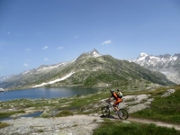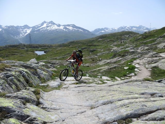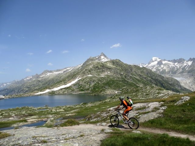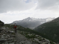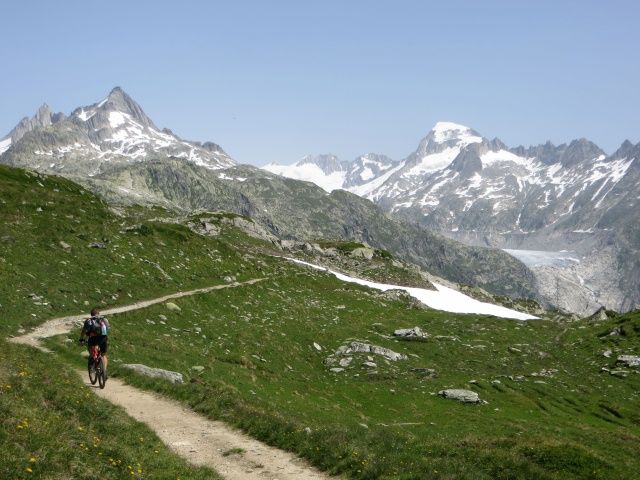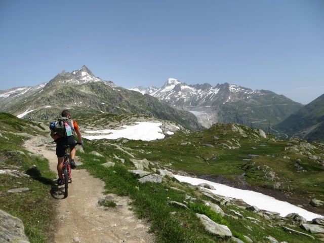 Single track per Bidmer, sullo sfondo il ghiacciaio del Rodano