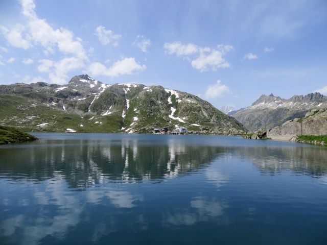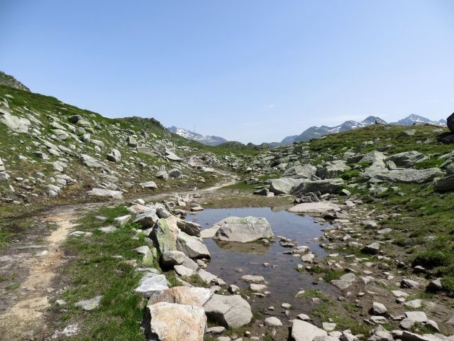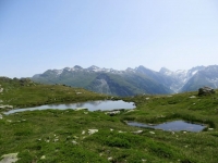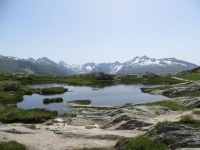 Laghetto alpino nei pressi del Grimselpass, sullo sfondo i rilievi della Geretal al confine con la Val Bedretto