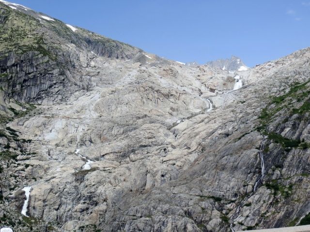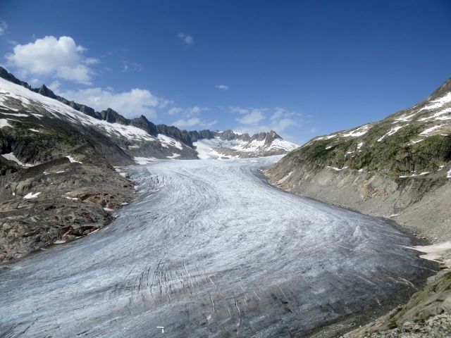 In direzione del Passo della Furca, panorama sul corso del Rodano e tratto terminale (roccioso con cascate) del relativo ghiacciaio