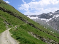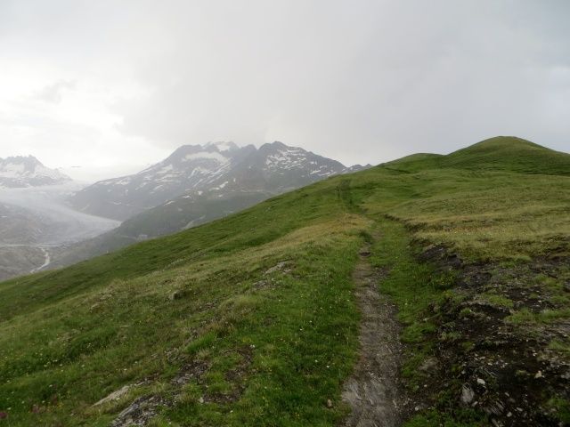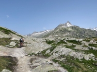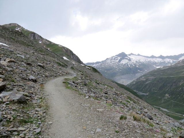 Tratto di sentiero finale per il Grimselpass, sullo sfondo il ghiacciaio del Rodano ed il Passo della Furka