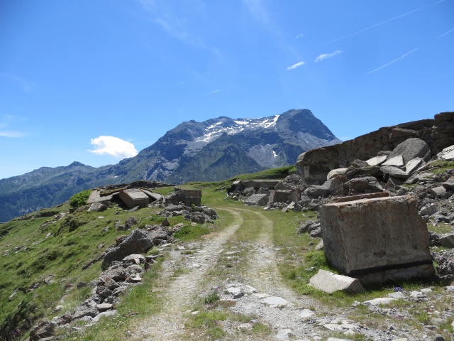 Risalita dalla diga per intercettare l'asfalto della strada del Moncenisio -  sullo sfondo la Punta Clairy