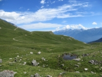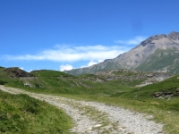 La poderale che attraversa il verde alpeggio in prossimità del lago del Moncenisio