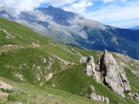 In direzione dell'Alpe Lamet - caratteristiche formazioni rocciose. Sullo sfondo il Lago Grande nei pressi dell'abitato di Moncenisio