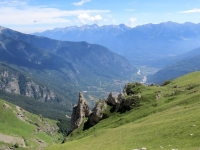 In direzione dell'Alpe Tour - caratteristiche formazioni rocciose, sullo sfondo la piana di Venaus