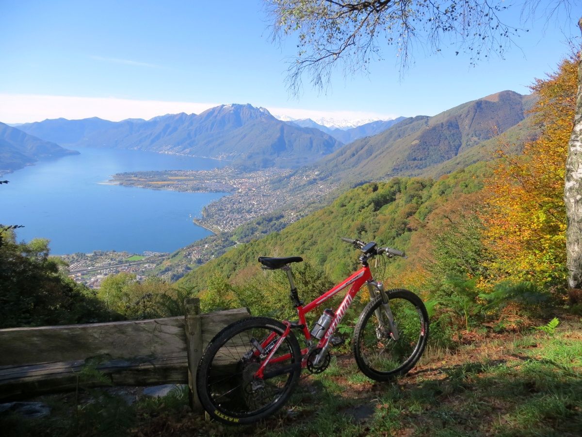 Partendo dalla quota base del piano di Magadino presso l’abitato di Cugnasco dove è presente una comoda e libera area di parcheggio (merce spesso rara in territorio elvetico) si risale su asfalto in direzione di Agarone e successivamente, attraverso una tranquilla strada secondaria, si giunge ai Monti di Ditto (quota 854) ove è presente, al centro del piccolo e caratteristico abitato in pietra, un eccezionale balcone panoramico sull’Alto Lago Maggiore con vista Mischabel. Proseguendo oltre si giunge poi ai Monti di Motti (1.062) dove risulta assolutamente doverosa una breve divagazione verso il centro dell’abitato seguendo le indicazioni del punto panoramico: qui la vista si apre grandiosa sul Lago Maggiore, sulla foce del Ticino, sul Mischabel e sul gruppo del Monte Rosa. Ritornati poi all’inizio dell’abitato, nei pressi del ristorante si stacca in salita una via in asfalto che entra in un bosco di faggi. La si segue facilmente sino a compiere alcuni tornanti dopodichè è da abbandonarsi in quanto poco dopo va a terminare nei pressi di una radura boschiva. Pertanto la traccia gps risale nel bosco seguendo (quota 1.110) una traccia di sentiero che si rivela inaspettatamente pedalabile, pur a fatica e con qualche brevissima e saltuaria interruzione a spinta: si giunge così con sudore e fatica alle costruzioni in pietra dei Monti della Scesa, quota 1.279. A questo punto però la pedalabilità cambia decisamente in peggio: troppo ripido, troppe fogli e troppi ostacoli per pedalare in continuità (in salita): pertanto va messo in preventivo di spingere il mezzo per circa 15/20 minuti, sino a giungere al punto in cui (quota 1.430 ca) il sentiero devia decisamente il verso di percorrenza con uno stretto angolo salendo ai margini dell’Alpe di Foppiana. Il grado di pedalabilità ora aumenta decisamente anche se qualche passaggio a spinta, brevissimo, va messo in preventivo sopratutto in relazione alle proprie energie fisiche rimaste; si lambisce, senza accorgersene, l’Alpe di Foppiana (quota massima 1.485 ca), si pedala in leggero falsopiano lungo il sentiero e poi si scende velocemente, sempre su sentiero ai Monti di Gola Secca (quota 1.300). A questo punto si evita di seguire il sentiero che taglierebbe a sinistra il versante montuoso (comporterebbe diversi tratti a mano da percorrere per superare vari saliscendi) e si continua in discesa, volgendo a destra, tra le abitazioni rurali dell’alpeggio. Superati i Monti Bared (1.210) la traccia gps si sviluppa sul sentiero che termina la propria corsa incrociando la strada asfaltata proveniente dai Monti della Motta (incrocio a quota 1.110 ca). Risalendo l’asfalto in breve si coprono i 2 km circa che ci separano dai Monti della Gana, quota 1.290 ca: vale la pena ignorare la deviazione sterrata che si presenta sulla sinistra per arrivare fino ai margini delle prime abitazioni per l’ottimo panorama offerto sul Lago Maggiore ed i circostanti rilievi, dopodichè si ritorna sui propri passi per qualche centinaio di metri deviando sulla sopracitata sterrata che si addentra nel bosco in falsopiano recante indicazioni sentieristiche per i Monti Velloni/Cugnasco. Dapprima si giunge ai prati dei Monti Pianelle, poi, sempre seguendo fedelmente la traccia gps che si snoda tra le abitazioni, si scende alle cascine dei Monti Velloni ed a seguire si affronta un impegnativo tratto di sentiero che scende in direzione di Curogna tra boschi con molteplici ostacoli rocciosi, terminando la propria corsa in una strada forestale. A questo punto si hanno due possibilità: la più facile prevede di girare a destra seguendo la sterrata che conduce in breve a Curogna e da li all’asfalto percorso all’andata in salita (poco copra Agarone); la più estrema invece, coperta dalla traccia gps, prevede di continuare a sinistra lungo la sterrata che va a perdersi presso l’attigua Alpe Ronchi, dove una traccia di sentiero, poco segnalato con dettaglio, scende lungo una scalinata e si snoda all’interno del bosco con notevole pendenza, fondo sassoso/roccioso e qualche passaggio d’equilibrio. Nulla di particolarmente ostile, sicuramente una via molto meno lineare e semplice che impone altissima prudenza e qualche tratto a mano (in relazione anche alle proprie capacità personali di discesa e la qualità del mezzo di cui si è dotati); tale sentiero va a terminare anch’esso sull’asfalto della strada percorsa all’andata, circa 240 metri più sotto rispetto alla più semplice alternativa sopra menzionata. D’ogni modo, a prescindere dalla alternativa scelta, occorrerà ripercorrere il nastro di asfalto sino al ritorno al punto iniziale