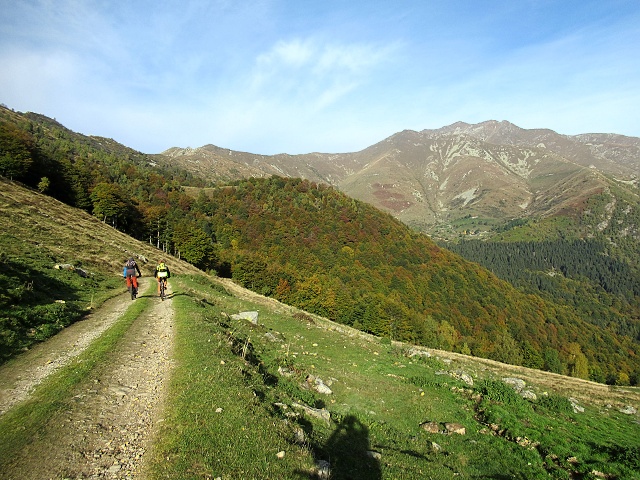 salita: a parte qualche brevissimo tratto in salita su sentiero tra l’Alpe Artignaga ed il Ponte tibetano e qualche tratto ciclabile lungo l’F6 dopo il Ponte dei Lavaggi, i passaggi in salita si sviluppano su ottime forestali e dunque la difficoltà è piuttosto bassa nel suo complesso. Anche le pendenze affrontate sono decisamente abbordabili nella visione globale del percorso e qui a seguire si segnalano i tratti più significativi: poco dopo l’Alpe Piana del Ponte in direzione dell’Alpe Calcinone si percorre un breve tratto su forestale di circa 300 metri con pendenze vicine al 14-15%; dopo aver attraversato con difficoltà il Rio Caramala, avvicinandosi all’Alpe d’Henri altri 400 metri con analoga pendenza; infine qualche centinaio di metri al 12-13% appena lasciata l’Alpe dei Lavaggi