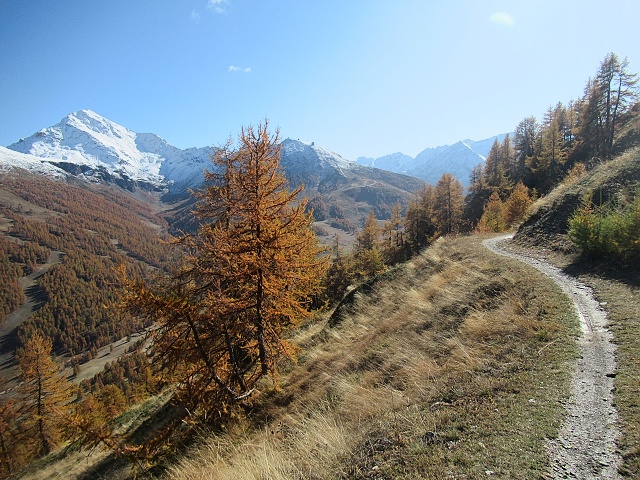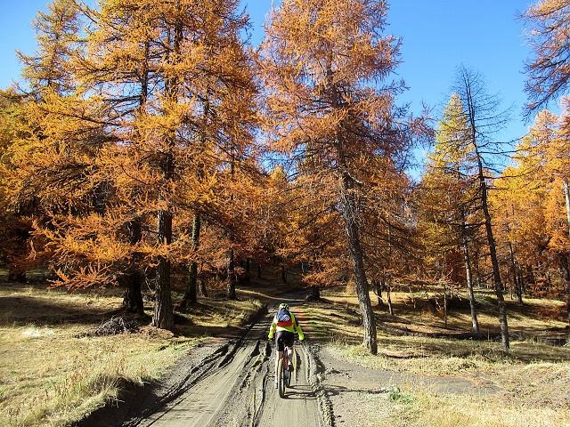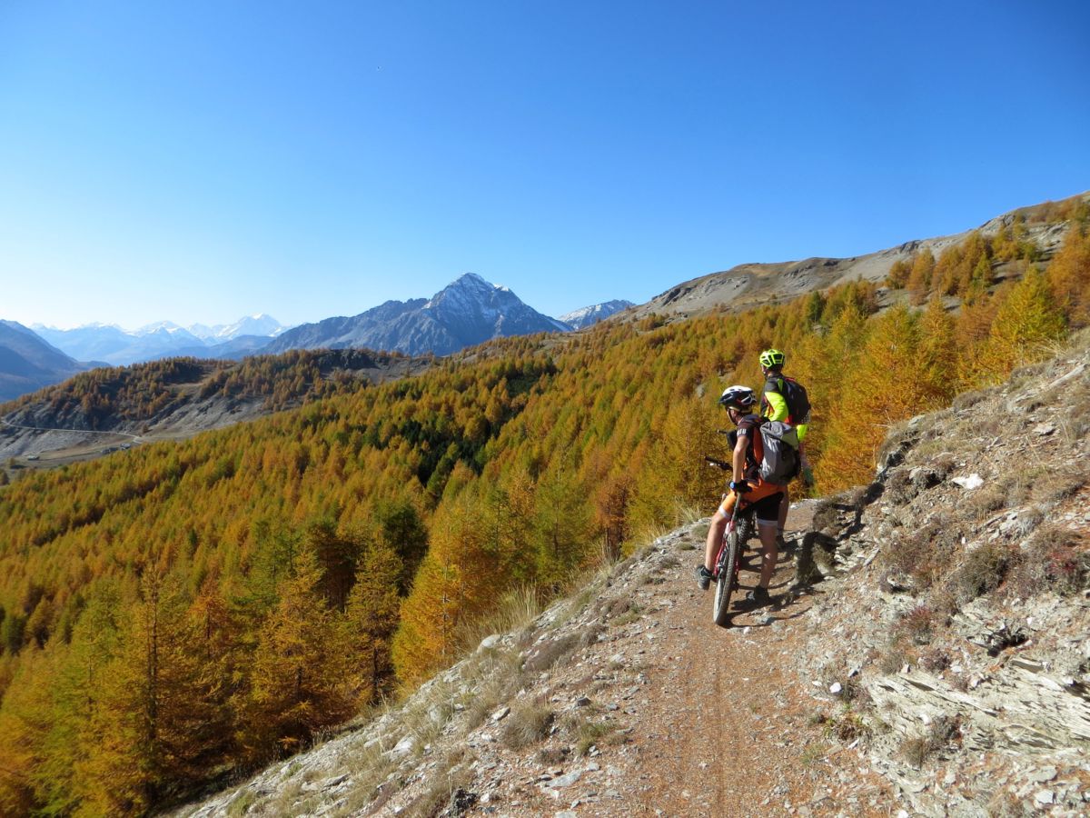 Il percorso ha inizio dal centro di Sauze d’Oulx su asfalto seguendo la salita per Richardette, facile e non particolarmente impegnativa, proseguendo in seguito oltre il citato villaggio fino ad abbandonare, dopo circa 3 km dalla partenza, l’asfalto per lo sterrato che si incontra sulla propria destra (1.850 mt); da qui in poi la maggior parte della salita si svolge su terreno tecnicamente semplice alternando pendenze contenute a (pochi) tratti più impegnativi, superando prima l’area degli impianti invernali del Monte Genevris, poi Pian della Rocca (2.080 mt) per arrivare nella piana di Sportinia (2.140 mt). La strada prosegue poi con continuità di salita e qualche strappo più impegnativo superando la Cappella di Notre Dame des Brousailles (2.330 mt) per arrivare in breve al Col Basset (2.425 mt) dove si incontra la Strada dell’Assietta proveniente dalla propria sinistra ed, evitando di imboccarla, si prosegue con ultimo tratto di salita per arrivare alla finestra (2.470 mt) sulla Val Chisone, punto di massima quota di giornata raggiunto dopo aver percorso circa 12 km dalla partenza. Qui la strada prosegue in discesa verso Sestriere ma è da percorrere per pochissimi metri in quanto è facilmente individuabile sul margine destro il bel sentiero che la taglia in più punti con divertenti passaggi alternati a spunti più tecnici (sopratutto per la ripida e scavata traccia che in taluni punti si è creata) e va seguito sino ad incontrare sulla destra un piccolo ruscello attorno a quota 2.240 mt; a questo punto si abbandona il sentiero principale per tagliare sulla deviazione – sempre su sentiero – che porta ad attraversare il corso d’acqua e con una brevissima ripida risalita ci si porta sul facile e panoramico largo sentiero che procede sostanzialmente in leggera salita tagliando il versante sud-orientale del Monte Fraiteve, sopra l’abitato di Sestriere: è il sentiero dedicato al maratoneta Gelindo Bordin. Il percorso è tecnicamente facile e salvo un paio di passaggi leggermente esposti attraversa in tranquillità e sicurezza splendidi boschi di larici terminando con l’incrocio – a quota 2.200 mt – di uno sterrato proveniente dalla sommità degli impianti del Fraiteve. Si prosegue quindi in decisa discesa seguendo tale carrareccia in direzione di San Sicario ed evitando di scendere eccessivamente la traccia gps prosegue poi in quota sovrastando l’area degli impianti di San Sicario per imboccare sulla destra – con successivo taglio della pista da sci – un sentiero (quota 2.070 mt) che entra all’interno del bosco; salvo qualche breve passaggio più impegnativo che potrebbe richiedere una possibile discesa dal mezzo per superare qualche ostacolo naturale, il sentiero si percorre, quasi sempre in discesa, senza particolari difficoltà sino a guadare un ruscello in prossimità dell’incrocio – quota 2.025 mt – con uno sterrato piuttosto ripido e sassoso che va seguito in discesa sino ad incontrare sulla destra, dopo una serie di tornanti, la deviazione (1.810 mt) per Autagne. Il fondo diviene ancora più scassato ma in breve si giunge al nucleo di case diroccate dell’abitato (1.680 mt), passate le quali si incontra sulla destra il contrassegnato bivio per il sentiero Autagne-Malafosse-San Marco. A questo punto inizia l’ultimo tratto di circa 9 km per chiudere l’anello: il sentiero, poco evidente nella parte iniziale, attraversa un prato e, dopo aver superato a mano un breve ripido tratto, entra nel bosco facendosi più evidente e ben mantenuto; trascurando le deviazioni che si presentano per Malafosse Alta, prima, e per Barracan, in seguito, al termine di un paio di strappi in salita si arriva a Jovenceaux (1.385 mt) dove attraversato il caratteristico borgo si intercetta l’asfalto che riporta in salita a Sauze d’Oulx