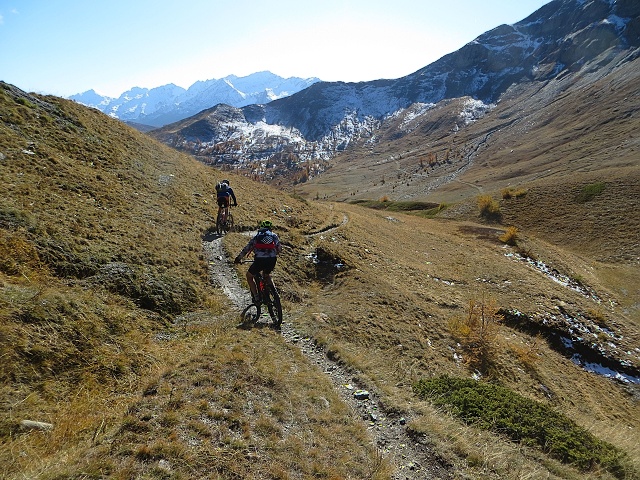 discesa: in parte su sentiero (da poco sopra il Colle Basset verso Sestriere fino all’attacco del Sentiero Bordin) ed in parte su sterrati; complessivamente la difficoltà tecnica è contenuta anche se lo stato degli sterrati/forestali percorse richiede attenzione in quanto si prende parecchia velocità su fondo costituito da ciottoli e pietre, talvolta anche su traccia scavata dalle acque