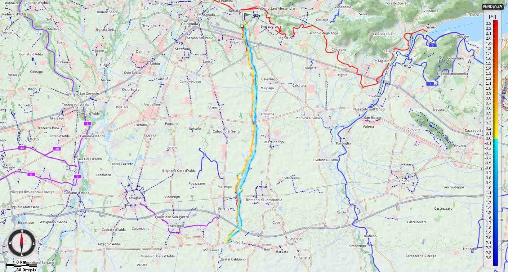 Il Giro qui proposto parte dal Parco dell’Oasi Verde di Seriate e compie un percorso ad anello all’interno del Parco Regionale del fiume Serio sfruttando la fitta rete di sentieri e strade sterrate che costeggiando il fiume spingendosi fino all’altezza del paese di Mozzanica nella bassa bergamasca. In considerazione del fatto che si incontrano molteplici varianti e bivi, peraltro la maggior parte dei quali sono ben segnalati con apposite bacheche e cartelli fissi, risulta arduo descrivere il percorso nei minimi (ed utili) dettagli e quindi si rimanda alla traccia gps ed all’uso di apposito navigatore. Il percorso risulta piuttosto agevole da percorrere con mountain bike, da segnalare qualche passaggio disagiato/di attenzione all’andata per argini erosi dal fiume e qualche brevissimo passaggio difficoltoso sulla via del ritorno (attraversamento a mano di un ponticello in ferro e qualche metro su sentiero sassoso)