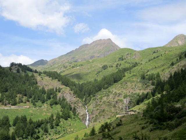 In primo piano l'Alpe di Moron con la vicina cascata, sullo sfondo il Monte Fallère