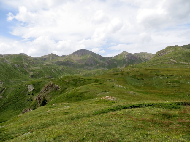 Panorama in prossimità dell'alpeggio Tsa de la Comba - sullo sfondo la corona di vette che circonda il Rifugio Mont Fallère (al centro poco visibile)