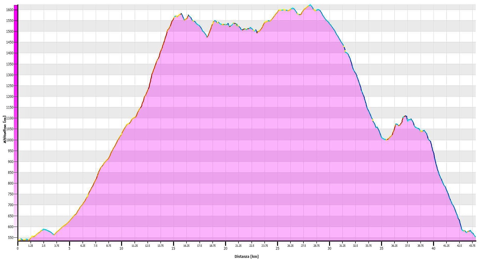 salita: sino alla deviazione per Piandera è poco più di un facile riscaldamento svolgendosi su asfalto con pendenze molto contenute, poi si inizia a salire con maggior decisione 9-12% su forestale a Cimadera e da li asfalto con pendenze ancor abbordabili (8-10%) sino all’inizio del tratto sterrato oltre il paese; oltre a Cimadera e fino alla Bocchetta di San Bernardo (o meglio poco prima di Cima della Pianca) si affronta impegnativa salita su forestale dal fondo a tratto scomposto e con pendenze che raramente scendono sotto il 14-15%e punte massime già segnalate sopra nella percorrenza non in sella; altro tratto impegnativo per le pendenze – ma non per il fondo – è la salita a Stinchè dove su cementata si raggiungono spesso punto al 14-17%