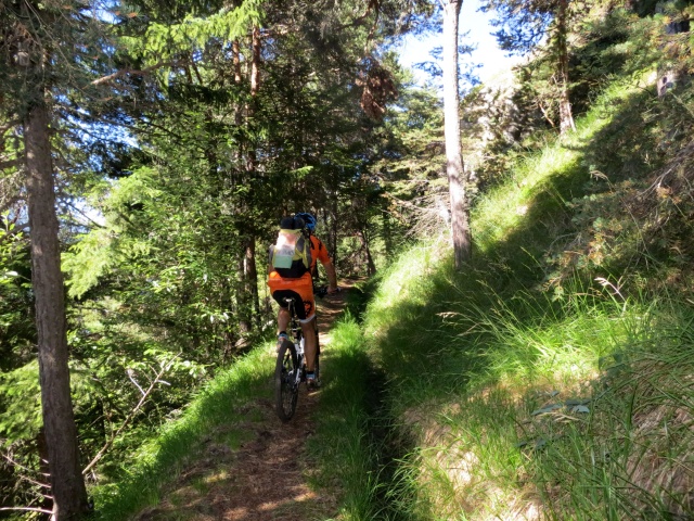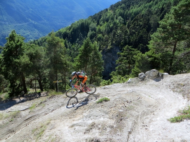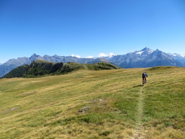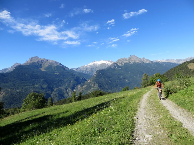 Un giro, quello di oggi, veramente di gran pregio: panorami fantastici nel grande pianoro della Valle Centrale di Aosta, con discesa prima in una immensa prateria con tratti flow e qualche altro discretamente impegnativo, che poi sul finale diventa tecnico e insidioso, fino alle porte di Fossaz.