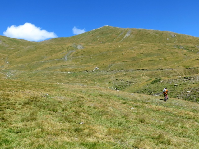 tratto a mano: stimiamo in 5 minuti complessivi per un breve tratto libero non pedalabile tra i prati al termine dello sterrato che sale all’Alpe Tsecrousa e per alcuni passaggi a mano durante la discesa lungo le pendici meridionali della Becca France per superare brevi balze rocciose e/o ostacoli naturali. Da segnalare che il tratto libero sui prati sopra citato all’inizio, con un poco di malizia può essere di fatto pedalato quasi completamente (alla fine meno di un minuto per superare una iniziale collinetta – molto dipende anche dalla direzione che si decide di seguire per raccordarsi con lo sterrato che si trova oltre il piccolo canyon che divide la vallata)