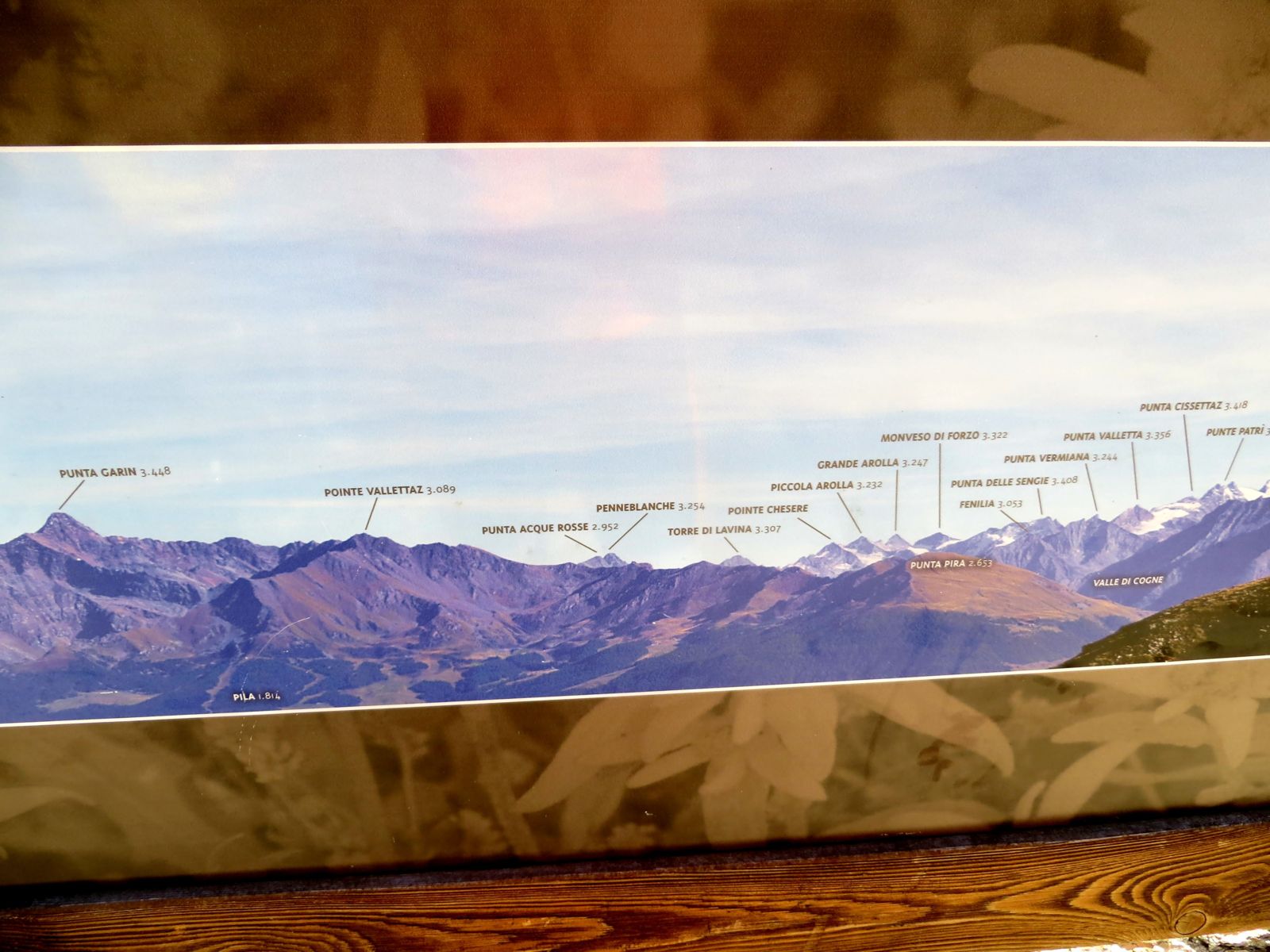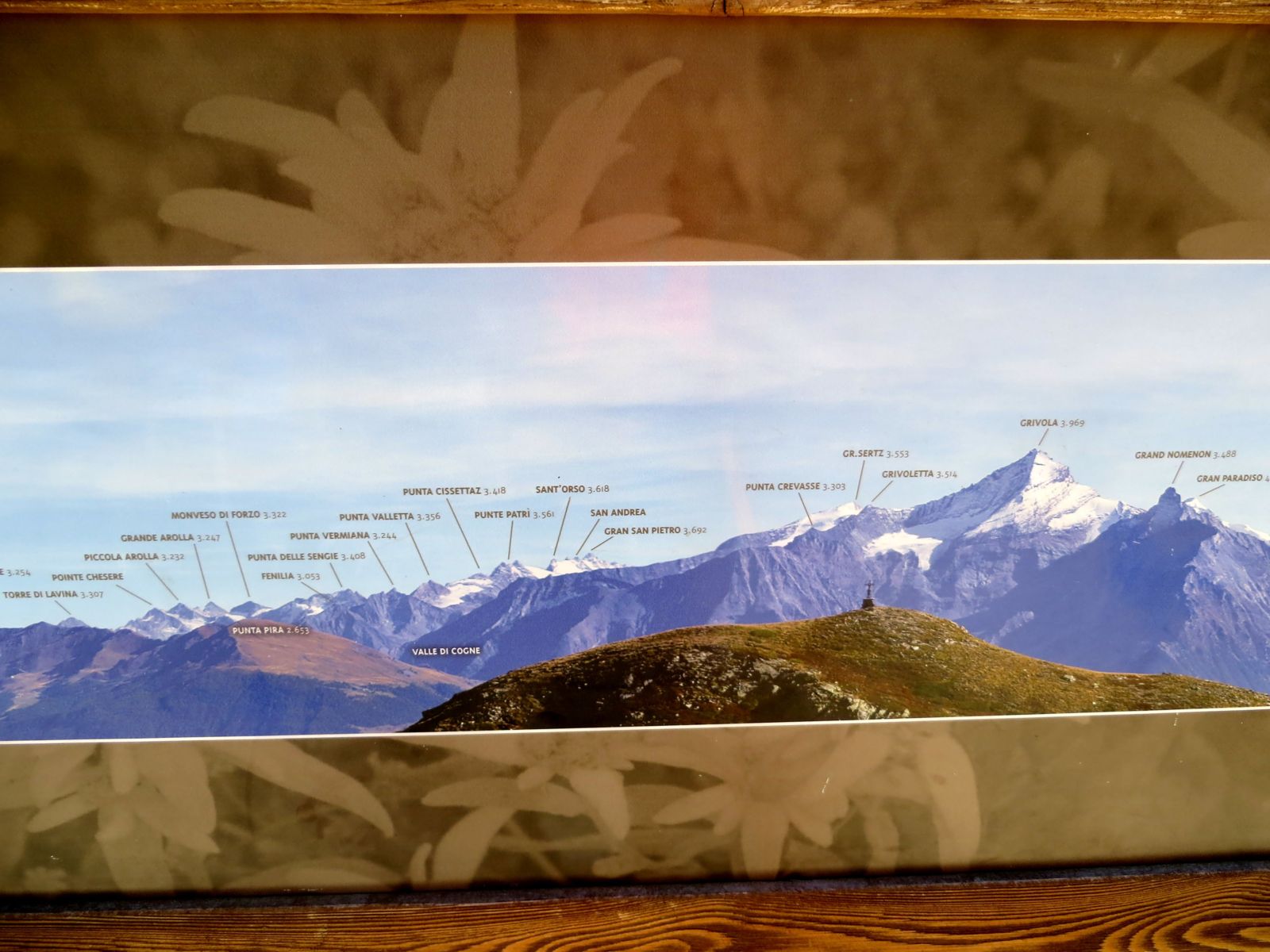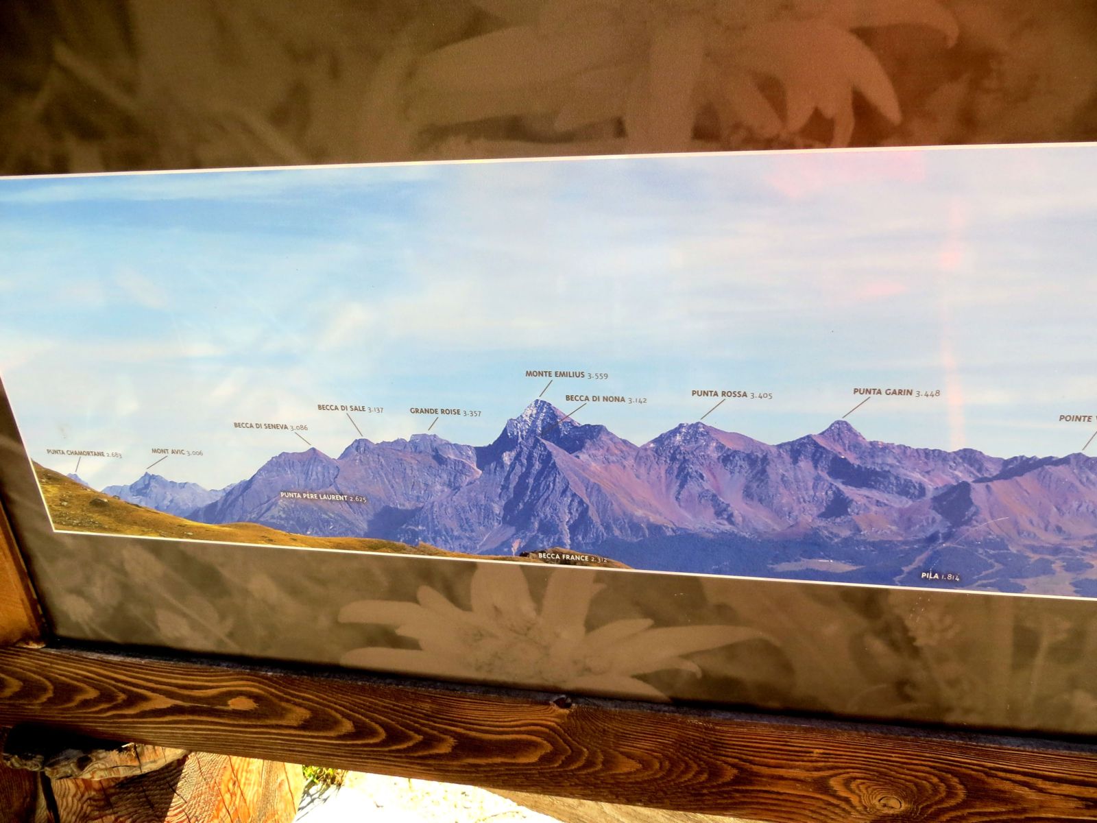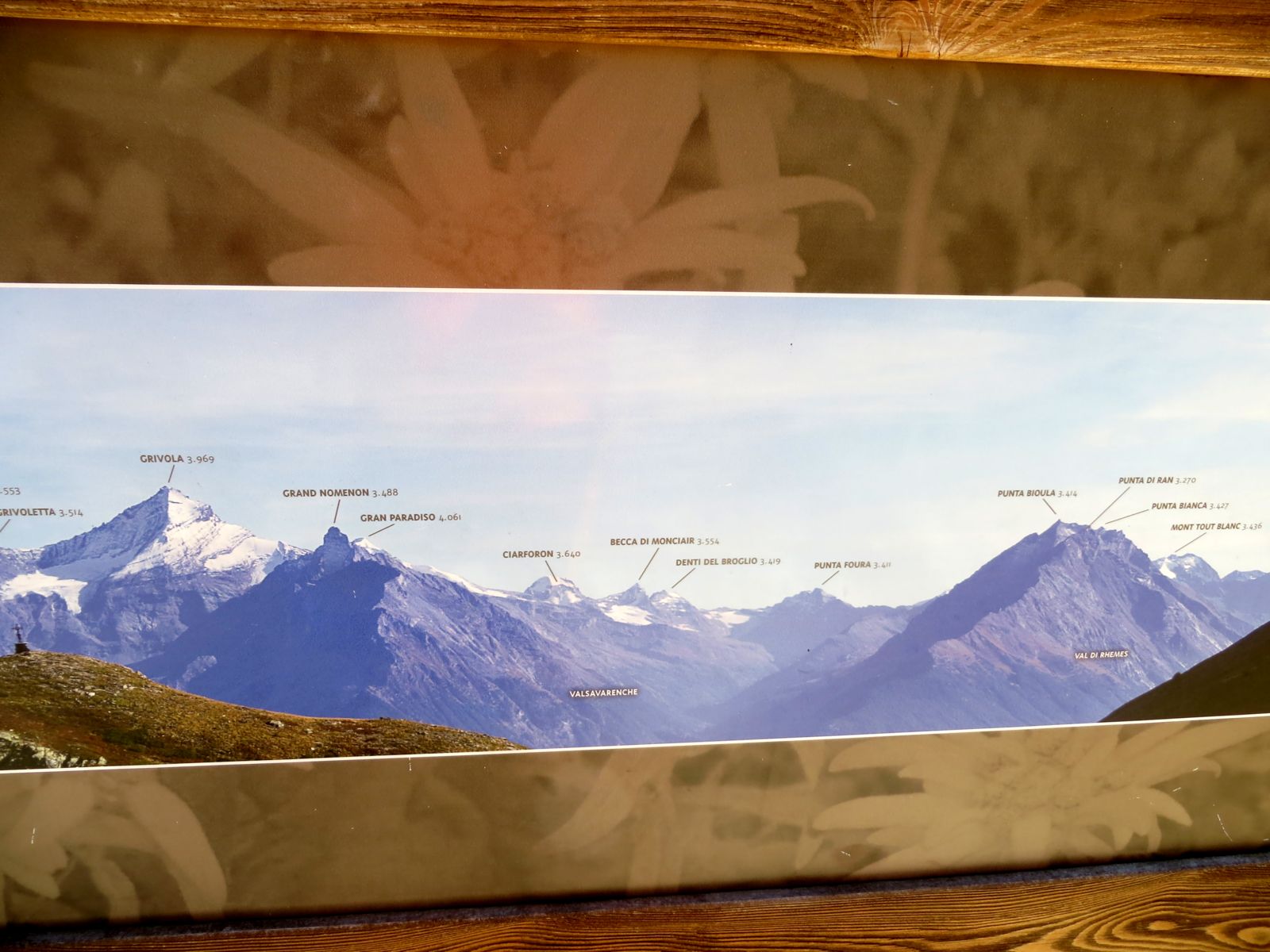vista: Grivola (3.969), punta del Gran Paradiso (4.061) e diverse vette del relativo Massiccio , Testa del Rutor (3.486) e relativo ghiacciaio – presso il rifugio Mont Fallere è presente una bacheca informativa sulle vette presenti nel panorama fronte rifugio su gruppo Monte Emilius (foto1), conca di Pila (foto2), massiccio del Gran Paradiso (foto3) e (foto4)