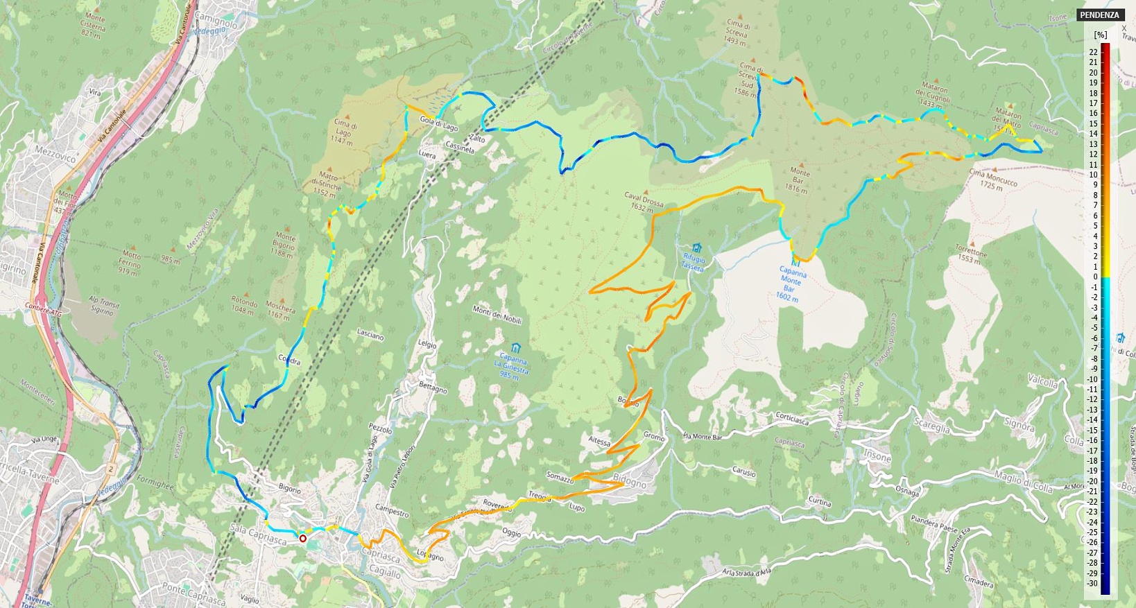 discesa: su sentiero sassoso ma tecnicamente non esigente fino all’Alpe Davrosio, poi sostanzialmente asfalto fino a Gola di Lago. Molto difficile il sentiero che scende da Condra: a tratti ripido, pietre e radici; non particolarmente scorrevole anche il sentiero che conduce a Sala Capriasca