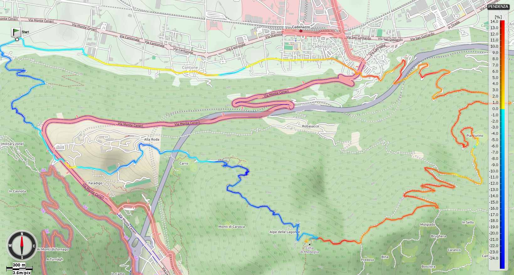 Il Giro si sviluppa nell’area del Ceneri e culmina con l’ascesa alla sommità della Cima di Medeglia, modesto rilievo sovrastante il Piano di Magadino, che tuttavia è in grado di offrire un’ottima vista panoramica a 360 gradi sulle prealpi ticinesi, sulle Prealpi varesine e sulla parte terminale del Lago Maggiore. Per opportunità di partenza, l’itinerario inizia dal piccolo abitato di Quartino dove transita il percorso ciclabile (su asfalto) ufficiale per bici (destinazione finale Bellinzona) che in pochi chilometri conduce in sostanziale andamento pianeggiante a Cadenazzo. Qui, incrociata la strada cantonale che sale a Monte Ceneri, la si percorre per poche decine di metri per deviare in seguito sulla sinistra e poi immediatamente a destra seguendo le indicazioni di cartelli escursionistici e sopratutto indicazioni per l’agriturismo “La Vigna”. Si percorrono quasi 3 km in salita su tranquilla strada in asfalto, priva di traffico veicolare, che risale la collina all’interno dei boschi, sino a giungere, anche superando brevi strappi dalle pendenze più importanti, al citato Agriturismo. Superato lo stesso, presso ampio piazzale si prosegue sempre su asfalto tenendo la sinistra e si affrontano ulteriori 2,5 km in ascesa terminando la corsa presso un’area di parcheggio ai margini del piccolo e caratteristico villaggio di Pianturino. Qui, chiare indicazioni segnaletiche impongono l’attraversamento del villaggio con bici a mano in considerazione dello stretto passaggio tra le abitazioni lungo un sentiero in salita: tuttavia il tratto è veramente molto breve e, in corrispondenza di una delle ultime abitazioni, si riprende ben presto a pedalare deviando sul sentiero che si stacca sulla destra. Il tratto a seguire impone adeguato livello di attenzione in quanto il trail è molto stretto ed a tratti esposto rispetto al sottostante pendio: per quanto appena citato, per qualche metro il mezzo va condotto in un paio di occasioni a mano. Tale sentiero, in continuo saliscendi, termina sulla strada in asfalto proveniente da Robasacco, in corrispondenza della partenza dello sterrato che sale alla Cima di Medeglia. Il tratto di fuoristrada che ora si presenta risulta mediamente piuttosto agevole fino oltre il Motto della Costa (nel mentre si incontra un bivio dove occorre proseguire a destra in salita), in seguito l’escursione volge su fondo irregolare costituito da pietre e terreno imperfetto, richiedendo pertanto qualche sforzo tecnico. Giunti a quota 1.220 ca si incontra un ultimo bivio: tenendo la sinistra nel giro di un paio di minuti si arriva su un terrazza panoramica erbosa sottostante la Cima di Medeglia e in meno di un minuto circa, abbandonato il mezzo si può giungere a piedi alla sovrastante sommità.