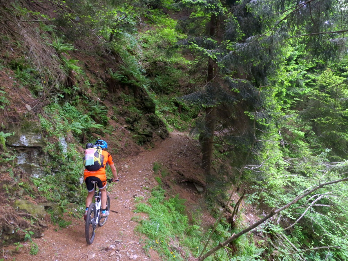 discesa: il sentiero che scende dalla Cima è piuttosto impegnativo in quanto presenta spesso passaggi poco lineari ed alternanza di radici, pietre e brevi tratti scorrevoli ancorchè si presta difatto ad essere compiuto interamente in sella non essendoci passaggi al limite e/o pericolosi