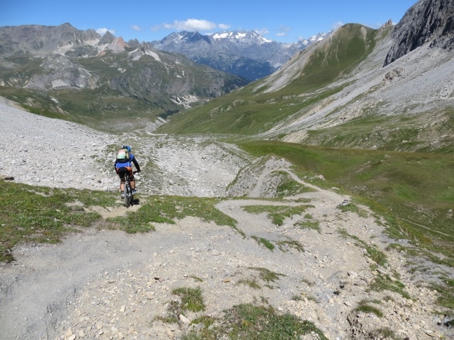 Discesa dal Colle della RhoGiro di straordinaria caratura a cavallo tra l’Italia e la Francia in grado di soddisfare i più esigenti praticanti della mountain bike nel contesto alpino: impegnative salite ciclabili su sterrati di origine militare, fantastiche discese lungo sentieri in parte scorrevoli, in parte tecnici, ampi panorami, portage limitato, 2 valichi alpini circondati da scenari montuosi decisamente diversi l’uno dell’altro, asfalto ridotto ai minimi termini, cosa dunque si può chiedere più di così ??? Si decide di fissare la partenza dalla frazione di Bardonecchia, Les Arnauds, dove è presente un ampio parcheggio dalla libera sosta e, ripresa la strada proveniente dal Col de l’Echelle, si prosegue in discesa per circa 900mt dove una sterrato pianeggiante si stacca sulla sinistra all’interno del bosco permettendo di aggirare il centro di Bardonecchia tenendosi sostanzialmente in quota (1.330). Ripreso poco dopo l’asfalto, si seguono inizialmente le indicazioni escursionistiche per la Grange della Rho percorrendo il Viale San Rocco, dopodichè la traccia gps le abbandona per tenersi su asfalto lungo una tranquilla strada che sale di quota con pendenze non significative. I 2 percorsi si incontreranno più avanti (circa 250 mt di quota più in alto), tuttavia a nostro avviso non vale assolutamente la pena in questa fase iniziale sprecare le energie nel percorrere la ripida mulattiera per risparmiare poco meno di 1,5 km di asfalto. Infatti, ben presto si incontra la deviazione per la militare sterrata che sale alla Grange della Rho ed al relativo vallone. Dopo un brevissimo tratto iniziale piuttosto abbordabile, la strada comincia ad inerpicarsi all’interno del bosco con pendenze più sostenute lungo il pendio della montagna. A quota 1.725, ignorata l’evidente deviazione ben segnalata per la Grange della Rho, la strada supera una sbarra proseguendo con ripide rampe all’interno del vallone e, dopo una decisa piega a sinistra, superata quota 1.930, si esce dal bosco e si prosegue sempre in decisa salita percorrendo un lungo traverso che taglia interamente le pendici della Cima della Blave. Il panorama offerto da questa sezione dell’itinerario è decisamente di rilievo dato che l’ampio vallone contrasta con le rocciose cime dal tipico aspetto dolomitico e sicuramente ciò mitiga la fatica indotta dal fondo non perfetto della militare e da alcune brevissime rampe decisamente impegnative, al limite della pedalata (probabilmente solo i più allenati riusciranno a percorrere interamente in sella le poche decine di metri in questione). A quota 2.220 ca si incontra una galleria che attraversa il fronte roccioso della montagna (tratto non lungo, opportuno comunque munirsi di illuminazione – vedasi però nota di aggiornamento a fondo pagina) ed a seguire la carrareccia riprende a salire con pendenze ora decisamente più abbordabili sino a giungere a Pian dei morti (quota 2.315), desolato pianoro sovrastato dai resti in ottimo stato di conservazione di una vecchia caserma militare. Proseguendo oltre, superata una corta, ma ripida, rampa su fondo parecchio dissestato (probabilmente non ciclabile dalla maggior parte di coloro che vi transitano), ci si inoltra nel vallone in direzione del Colle della Rho tenendosi sulla sinistra i ghiaioni della Cima della Planette e della Rocca Bernauda, seguendo le meno evidenti tracce della militare che ora ha perso il fondo sterrato scorrendo per lo più su traccia prativa misto pietre sparse. Le pendenze riprendono ad essere decisamente importanti ed i più allenati riusciranno a pedalare sino a quota 2.460/2.450, nei pressi dell’attacco finale del sentiero prima di una balza rocciosa (non pedalabile, sia per pendenza che per fondo): da qui occorrerà portare la bici a spalla/spinta per 10 minuti circa per superare il citato scalino roccioso (ca 60 metri di dislivello) e poi si riuscirà a riprendere la pedalata per gli ultimi metri di salita su sentiero prima di giungere al tanto sospirato Colle della Rho (2.541), incastrato tra la Gran Bagna e la Punta Nera. Inizia ora la discesa nel vallone francese seguendo un sentiero impegnativo che si sviluppa su fondo costituito da ghiaia e pietre e che richiede pertanto padronanza del mezzo, esperienza ed un tocco di malizia. Giunti a quota 2.280 il sentiero incontra una biforcazione: a sinistra si prosegue per il Col de la Replanette, classico itinerario conosciuto dai bikers (che comporta 20-30 minuti di portage per superare circa 150 mt di dislivello dato che il sentiero che lo risale non permette la ciclabilità). Noi abbiamo deciso (per evitare portage, per creare un itinerario “nuovo” e per esplorare l’interessante vallone francese) di proseguire diritti scendendo ulteriormente su splendido e facile sentiero all’interno del Vallone della Roue, superando, dopo un tratto prativo un corso d’acqua in secca per congiungersi ad una sterrata di collegamento ai pascoli. La carrareccia scende verso valle e si congiunge alla rotabile che sale verso il Colle del Frejus che viene seguita, sempre in discesa, per circa 700 metri allorchè la traccia gps devia su sentiero prativo tagliando il successivo bivio ed evitando così di dover riprendere successivamente quota (nulla vieta comunque di proseguire su militare per poi deviare a sinistra al bivio che si incontra). Inizia a questo punto la seconda “grande fatica” della giornata: la risalita del vallone francese sino al Colle di Valle Stretta. Dalla quota di 1.950 si inizia infatti a risalire su un ripido sterrato proveniente dalla nota stazione sciistica di Valfrejus; alcuni tornanti iniziali mitigano le impegnative pendenze della strada anche se occorrerà affrontare 4-5 rampe decisamente ostiche che metteranno a dura prova le residue energie rimaste e non ci sarà da sorprendersi se, inevitabilmente, occorrerà intervallare la risalita con qualche pausa rigenerante. Il tratto più impegnativo, fortunatamente sempre su b