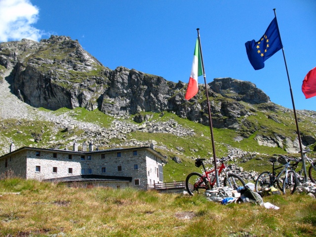Panoramica sul traverso ciclabile, sul rifugio Arp e sulla Punta Valfredda