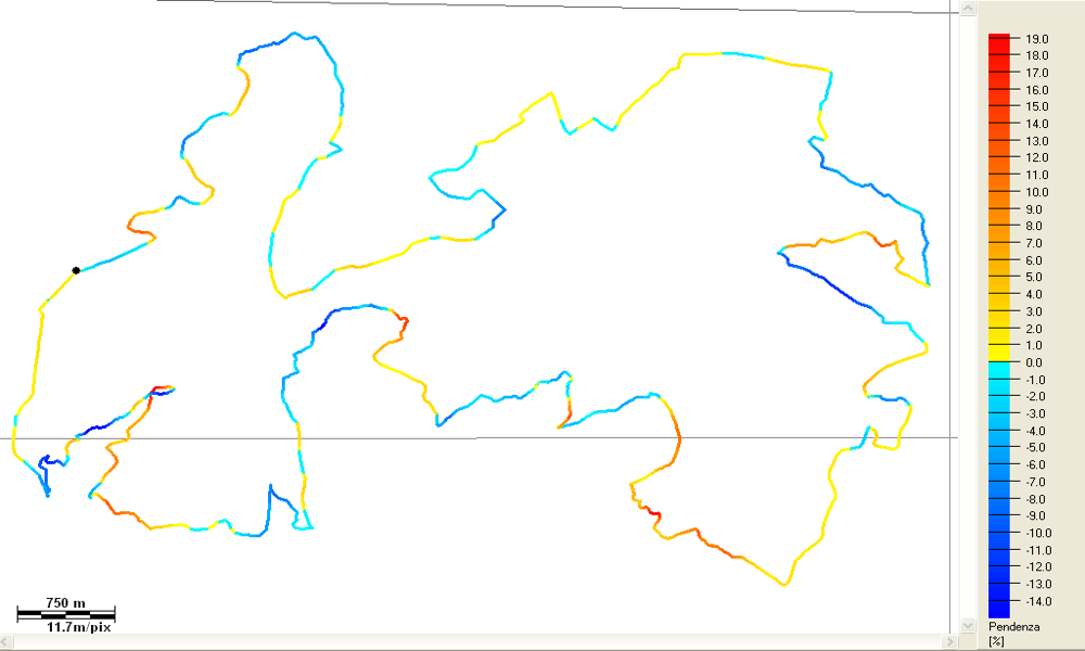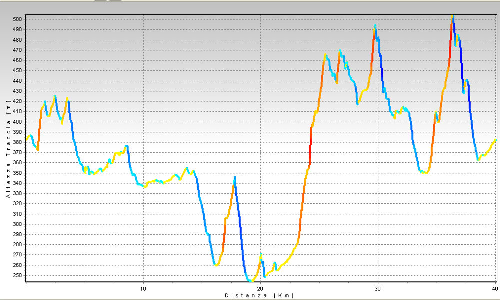 salita: continui sali-scendi e con alcuni brevi tratti caratterizzati da significativa pendenza che raggiunge punte del 19% (in specie in località Bizzarone e in località Colle di S.Maffeo)