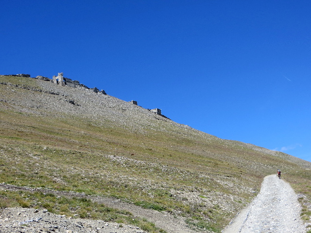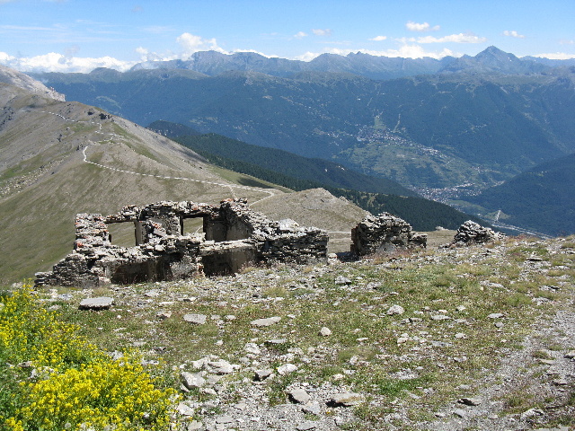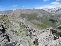 Resti della casermetta militare nei pressi del Colle Jafferau, sullo sfondo il forte Jafferau posto sull'omonima sommità