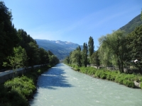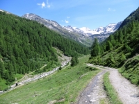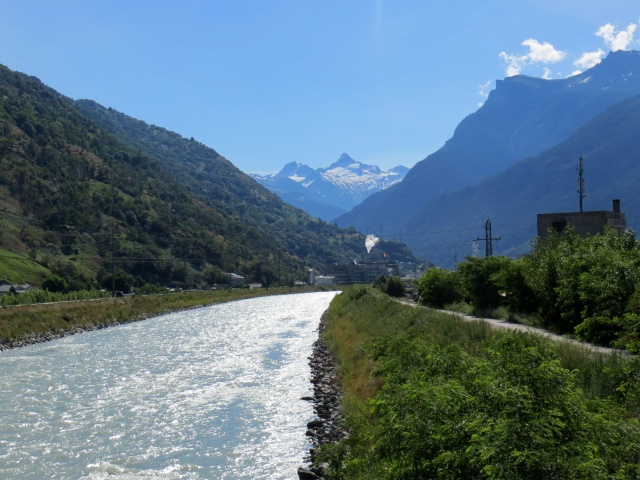 Fiume Rodano, vista in direzione di Briga, sullo sfondo le vette dell'Alpe Veglia - Bortelhorn (Punta del Rebbio, 3.194) ed Hillehorn (Punta Mottisca, 3.181)