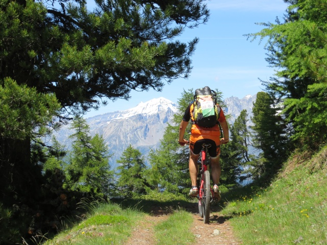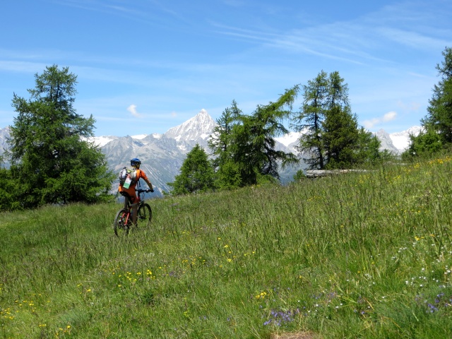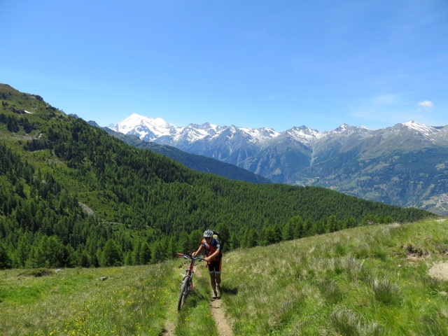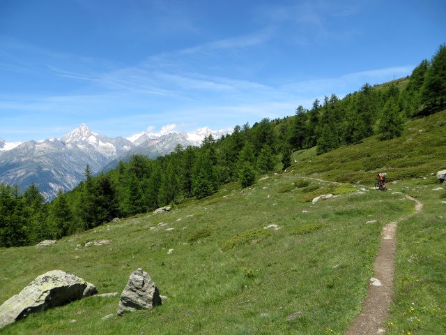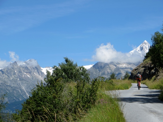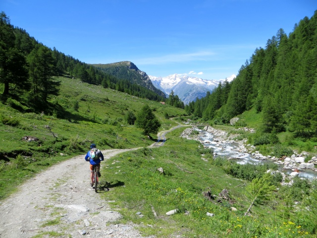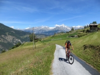Nel corso della discesa su sterrato nella Nanztal dal Gebidumpass, sullo sfondo le vette che sovrastano il Passo del Sempione, tra cui il Fletschhorn (3.985)