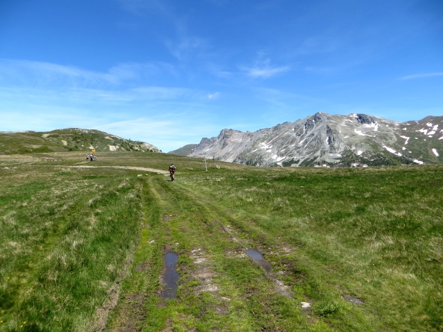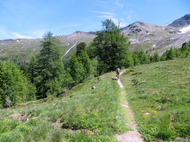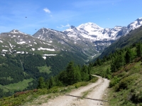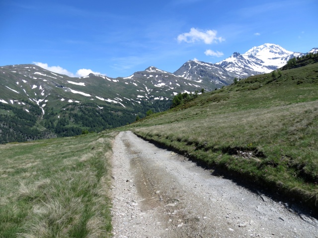 Inizio della discesa su sterrato nella Nanztal dal Gebidumpass, sullo sfondo le vette che sovrastano il Passo del Sempione, tra cui il Fletschhorn (3.985)