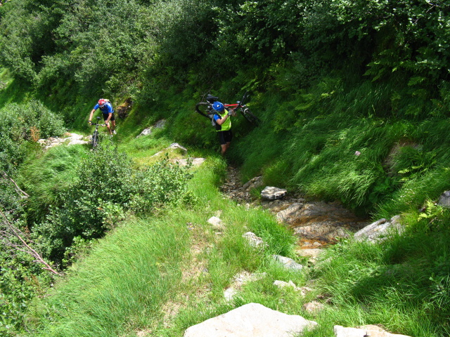tratto a mano: in salita di circa 1,5 km per 50 minuti tra Piano delle Pecore e la Bocchetta di Sommafiume; continue interruzioni in discesa dovuta alla presenza di sassi, curve strette e sentieri impraticabili (circa 30 minuti)