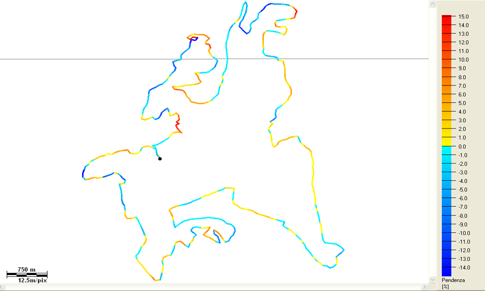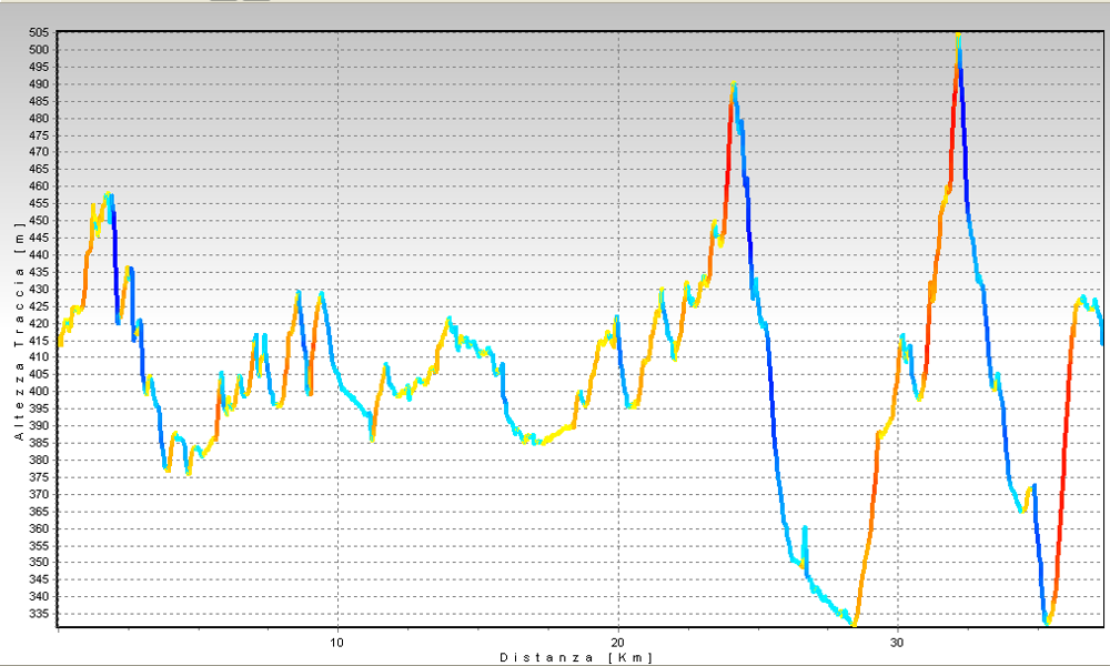 salita: nella seconda parte del giro si segnalano 4 brevi salite con pendenze tra il 12 ed il 15%