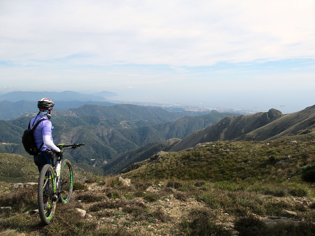 vista: valle del Gorzente, Piani di Praglia, costa ligure attorno a Genova, vari rilievi del parco delle Capanne di Marcarolo; nelle giornate terse si possono ben individuare il Monviso e parte dell’arco alpino con il Monte Rosa in evidenza