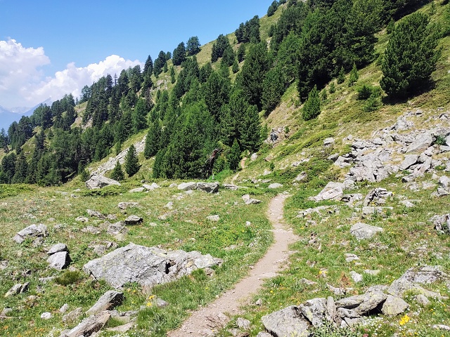 Il sentiero che scende dal Passo Invergneux nel vallone di Grauson - primo attraversamento del torrente