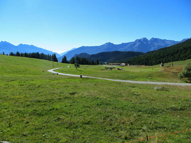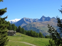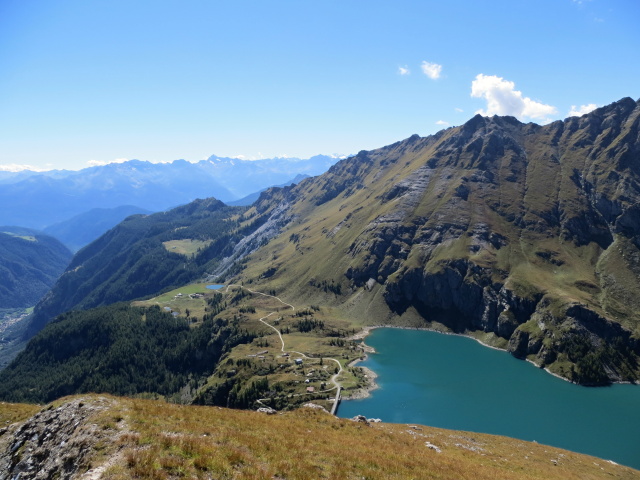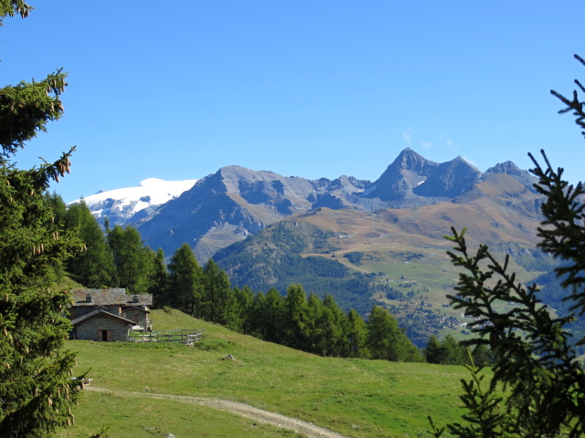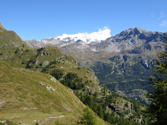 Panoramica sul tragitto percorso, si intravede l'Alpe di Gilliarey, l'Alpe Cortina con il relativo Lago ed il pianoro del bacino di Cignana con il rifugio Barmasse