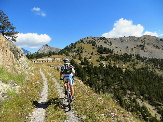 L’itinerario si sviluppa lungo le vecchie strade militari che collegavano le diverse fortificazioni della linea militare francese eretta tra la fine dell’800 ed i primi del ‘900, a difesa delle truppe italiane, compiendo un anello allargato attorno al Monte Janus con ascesa all’antecima della panoramica vetta dove sono presenti i resti di una caserma e postazioni di combattimento. La partenza ha luogo da Monginevro, nei pressi di una comoda area libera di parcheggio in Rue des Chalmettes dove si imbocca la Rue du Bois de Sestriere, inizialmente traccia in asfalto ma ben presto in sterrato che in modesta discesa supera la deviazione per il forte Gondran e prosegue in direzione di La Vachette giungendo al Belvedere, ottimo punto panoramico sulla valle della Clarée. Ora la traccia scende decisa attraverso una serie di tornanti e seguendo le indicazioni per Liaison Vachette lungo il segnavia GR5 perdendo circa 400 metri di quota (quota minima 1.415), per riprendere leggermente a salire nel bosco sino a giungere nei pressi del Fort Dauphin (1.469). Sulla sinistra sale decisa una sterrata dal fondo smosso che si collega rapidamente alla militare proveniente dal Fort du Randouillet. Evitando di proseguire per tale forte, si tiene la sinistra e si continua a salire agevolmente per il Clot de l’Infernet (1.944) incontrando successivamente i vecchi baraccamenti de La Seyte (2.070). Mantenendo ancora una volta la sinistra la strada supera i resti di una lunga caserma continuando lungo una traccia di sentiero che attraverso una serie di tornanti sale con ottima ciclabilità sino al bivio per il Fort de L’infernet (quota 2.240). La percorrenza di questo tratto in genere è piuttosto agevole fatto salve alcune (2/3, non di più) brevissime interruzioni di pedalata causate da ostacoli naturali (grossi massi e tronchi che ostruiscono il passaggio) ed offre interessanti panorami sulla sottostante vallata di Briançon e della valle della Guisanne, sulla valle della Clarée con scorci sul massiccio degli Ecrins. Superato gli ennesimi resti di fortificazione militare che si incontrano lungo il percorso ed evitando la salita per l’Infernet si prosegue ora in leggera discesa sino ai baraccamenti di La Cochette (2.233) dove si incontra un panoramico traverso che in leggera salita porta verso il Fort Gondran. Al successivo bivio si mantiene la sinistra imboccando un tratto di strada in asfalto (successivamente ritorna sterrato) che conduce nei pressi di un’area a destinazione militare oltre la quale, superata una sbarra, inizia la salita per lo Janus: affrontando 2,5 km di salita con pendenze tra il 10 ed il 14% si giunge nel giro di 15-20 minuti ai 2.516 metri del Fort Janus, punta massima di giornata. Volendo, a piedi, agevolmente si può giungere alla vetta dello Janus ma il pianoro ove sorgono i resti dell’antico forte risulta adeguatamente panoramico su più fronti e permette dunque di evitare l’ulteriore (modesta) ascesa. Si ritorna poi a ritroso sullo stessa traccia sino all’area militare ai piedi dello Janus e si prosegue in salita transitando ai margini del Fort du Gondran, tra vecchi ricoveri e baraccamenti militari, sino ad un colletto nei pressi di una fortificazione (quota 2.400) con successiva discesa dove si incontrano i cartelli escursionistici per il Lac du Gignoux (anche noto come Lago dei Setti Colori). Attraverso un ottimo single-track in saliscendi, superato il lago di Rouséux, senza margine di errore si giunge ben presto al Gignoux (2.330) dove attende una breve (250 mt ca) ma impegnativa salita su sterrato che solo con eccellente allenamento sarà possibile pedalare interamente data la pendenza abbinata al fondo non ottimale. Al termine della salita si prosegue tenendo la sinistra sfiancando la Cime de Saurel (indifferente proseguire su sentiero o sulla sterrata che corrono tra loro paralleli). Al successivo bivio, evitando di proseguire dritto per il Colle Bercia, la traccia segue un single-track in discesa nella Val Gimont, mediamente non impegnativo salvo un paio di passaggi iniziali che richiedono cautela in quanto piuttosto ripidi/scavati, al termine del quale si incrocia una sterrata, in località Pian del Sole, che occorre risalire, tenendo la sinistra, per circa 300 metri sino alla stazione degli impianti di Claviere. A questo punto una veloce discesa lungo la pista da sci che si stacca sulla sinistra conduce rapidamente nei pressi del centro Golf di Monginevro dove una semplice sterrata che vi corre parallela porta all’abitato