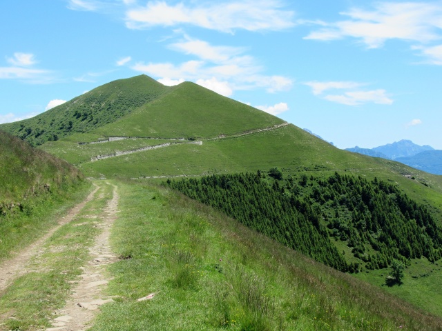 – superato il Rifugio Venini e percorrendo la strada militare, dopo circa 1 km ci si stacca sulla sinistra per salire su scassato sterrato in salita all’Alpe di Mezzegra (1.610) e poi proseguire oltre su traverso in falsopiano single-track (traccia molto stretta ma pedalabile al 95% con un po’ di esperienza in sentieri) sino ai margini dell’Alpe di Tremezzo raggiungibile con ultimi metri a piedi causa rocce ed ostacoli vari. Poco dopo l’Alpe si può lasciare il mezzo per risalire a piedi in meno di 5 minuti alla sommità del Monte Crocione, poi ripreso il mezzo si segue la traccia gps che dall’alpe segue un quasi inesistente sentiero che taglia il pendio e che va ad intercettare la militare proveniente dal Venini; la prima parte di questo sentiero (o presunto tale) si riesce a fare in sella poi la pendenza aumenta, la traccia si fa più scavata con rocce e piccoli salti per cui richiede circa 5 minuti a mano.