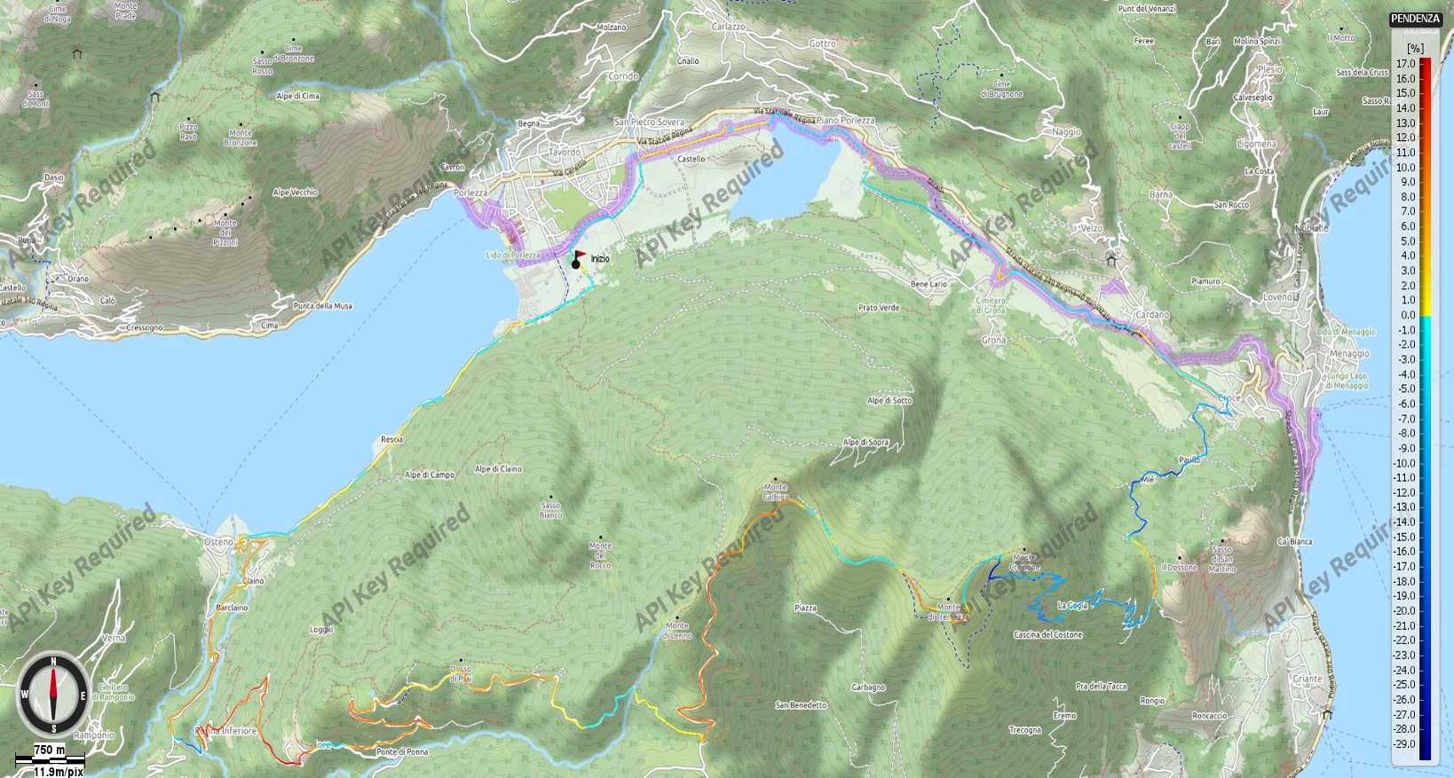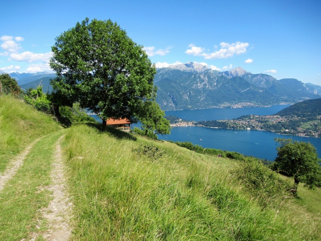 Il giro parte dal Lago Ceresio presso l’abitato di Porlezza e per mezzo di una lunga ed a tratti faticosa salita su asfalto raggiunge la dorsale occidentale del Lago di Como transitando su bella militare sotto le cime dei più noti rilievi locali (il Monte Galbiga, il Monte di Tremezzo ed il Monte Crocione). I primi km sono piuttosto tranquilli in quanto si sviluppano su asfalto costeggiando il Lago Ceresio in direzione di Osteno passando per le caratteristiche cascate di Rescia, poi si comincia a salire verso la Valle di Intelvi transitando da Claino e successivamente verso Laino seguendo le indicazioni per il Rifugio Boffalora e l’Alpe di Ponna; dopo aver superato il ponte di Ponna e prima di giungere all’Alpe Tellero la traccia effettua una deviazione fuori asfalto seguendo le indicazioni per la MTB: la deviazione porta però ad incontrare circa 200/250 metri di ripida salita su scassata forestale (pendenze di circa 15-18%) e si ricongiunge con la via asfaltata poco prima dell’Alpe di Ponna (pertanto se non si è disposti ad aggiungere fatica conviene rimane su asfalto). Dopo l’Alpe di Ponna si attraversa una bella faggeta e si prosegue lungo una bella sterrata pianeggiante che dopo poco più di 2 km termina presso il Passo Boffalora nelle vicinanze dell’omonimo rifugio. Ritrovato l’asfalto si prosegue ora in salita senza margine di errore seguendo le indicazioni per il Rifugio Venini; dapprima si transita presso l’alpe di Ossuccio, poi presso l’Alpe di Lenno ed infine poco prima del Rifugio Venini si incontra lo sterrato che conduce alla bocchetta dove è posizionato il Rifugio e da dove parte un bel percorso in quota lungo l’antica militare con grandiosi panorami sul lago di Como e le prealpi comasche-lecchesi; tenendo lo sterrato principale si tagliano in leggera discesa le pendici del Monte di Tremezzo e del Monte Crocione per proseguire poi su un sentiero, a tratti esposto, che sotto la vetta del Crocione perde di quota con molteplici stretti tornanti, attraversa un paio di pietraie ed infine una galleria non illuminata (ma percorribile grazie alla minima luce solare che filtra all’interno); la traccia si fa ora più ampia scendendo nel bosco sino a giungere ai Monti di Nava e superato un breve tratto in salita, si continua a scendere dapprima su cementata/sterrato e poi su asfalto sino a valle in località Croce. Alternando ora tratti su strada, varianti sterrate e la ciclabile Menaggio-Porlezza si transita nei pressi della Riserva Naturale del Lago di Piano e ci si ritrovo a Porlezza.