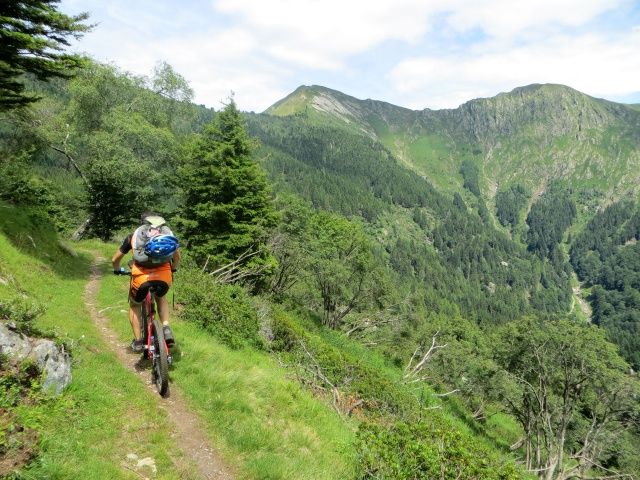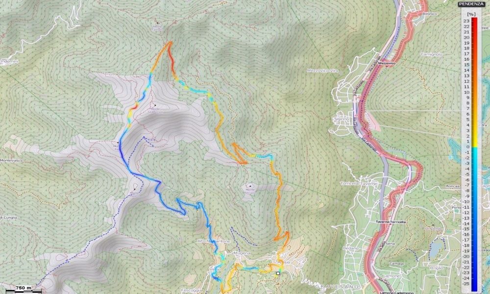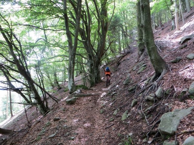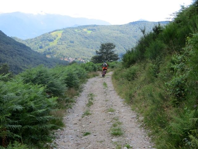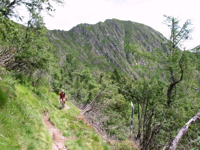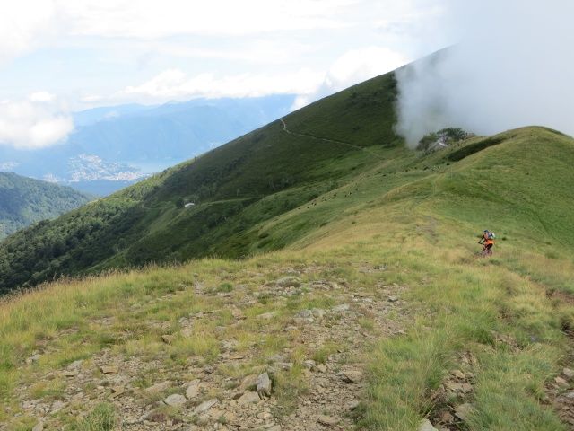 tratto a mano: complessivi 35 minuti, escludendo la salita a piedi alla cima. Qualche centinaio di metri dopo l’Alpe Canigiolo il sentiero diviene in molti punti troppo ripido/sconnesso/pietroso per poter essere pedalato con continuità e fino a quota 1.650 ca il tratto a mano è di complessivi 15-20 minuti a seconda di quanto si riesce effettivamente a pedalare; dopo la Bassa di Indemini il superamento di un motto con sentiero ripido e sconnesso comporta circa 3 minuti a spinta; infine dopo la Bassa di Montoia, fino a giungere al traverso finale che incontra il sentiero che scende dalla sommità del Gradiccioli, il sentiero in doppio saliscendi comporta circa 15 minuti a spinta in quanto troppo roccioso