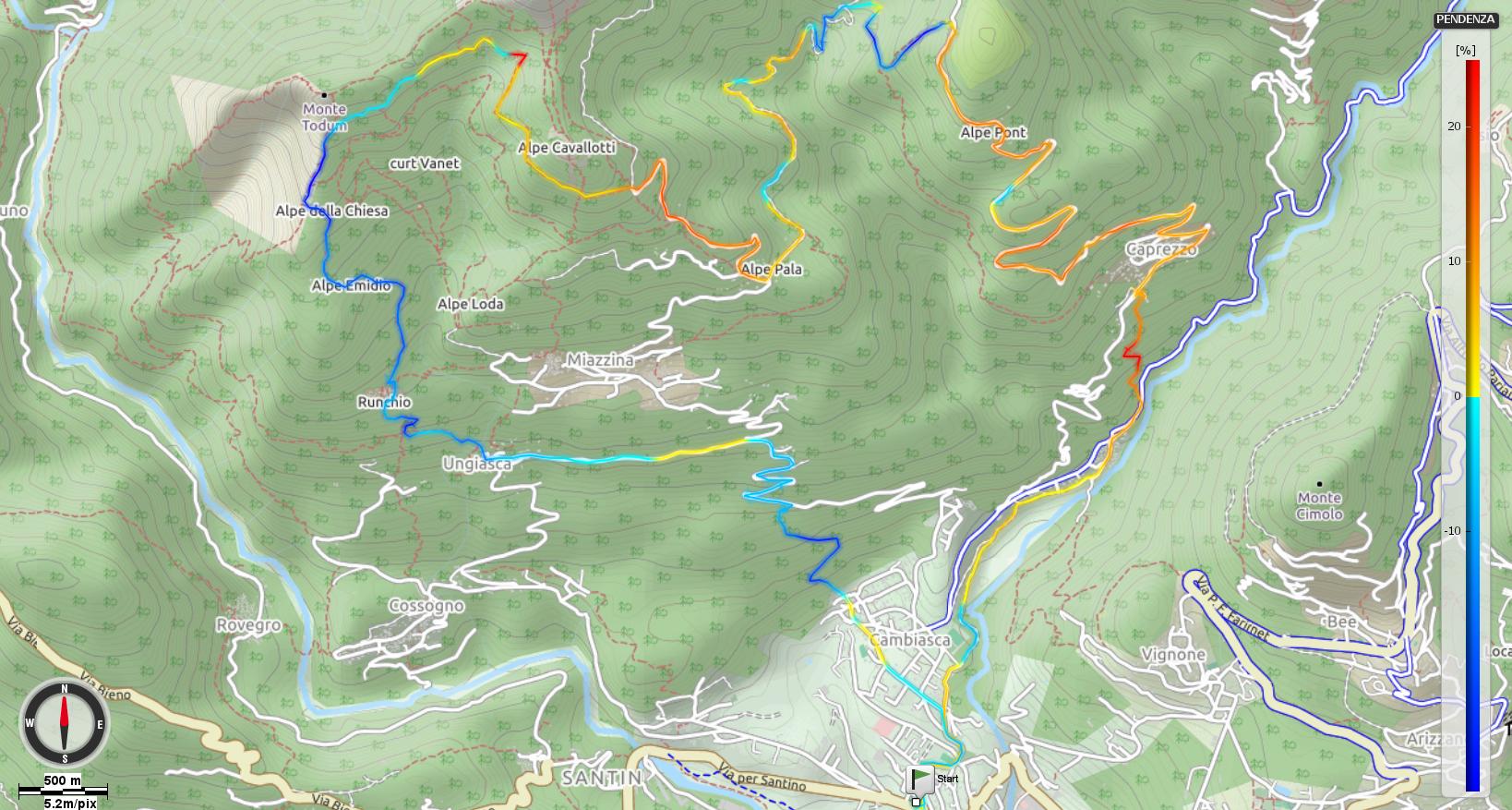 Il giro ha inizio tra Pallanza e l’abitato di Cambiasca nei pressi di una comoda piazza a posteggio libero (piazza Ferruccio Parri) dove si risale su asfalto in direzione di Cambiasca lungo la strada per la Valle Intragna che la traccia abbandona quasi subito sfruttando una via ciclopedonale e successivamente uno sterrato sino al piccolo abitato di Ramello. Appena qui ripresa la strada principale, si incontrano sulla sinistra le indicazioni escursionistiche per Caprezzo deviando su una mulattiera inizialmente dalle pendenze modeste e ben tenuta anche se con il procedere il fondo diviene sempre più impegnativo sino ad incontrare una parte centrale assolutamente non ciclabile causa terreno dissestato (superata nel giro di 5/6 minuti a spinta). Alternando tratti ripidi a tratti più tranquilli si perviene a Caprezzo nei pressi del cimitero ove si ritrova l’asfalto: proseguendo in salita la strada alterna tratti tranquilli a tratti più impegnativi offrendo saltuariamente panoramici scorci del Lago Maggiore e del Monte Mottarone. Giunti a quota 1.040 la traccia gps lascia la strada asfaltata per prendere un sentiero a sinistra (presente un “misterioso” cartello segnaletico in legno le cui indicazioni sono scomparse nel tempo) che scende all’Alpe Ad Vel, superando poi le baite dell’alpeggio e deviando a destra tra i prati in direzione del bosco lungo una esile traccia di sentiero che presenta qualche tratto tecnico accentuato dall’erosione delle acque fino ad arrivare alla presa dell’acquedotto. Si segue ora il sentiero ricavato lungo la linea della condotta prestando al contempo MOLTA attenzione all’attraversamento di alcuni ponticelli artificiali in cemento dato che sono stretti e privi di protezioni laterali, sino ad incrociare la forestale che sale, a sinistra, dall’Alpe Agricola: purtroppo la strada è stata sbarrata nei pressi dell’alpeggio (lecito ?? mah….d’ogni modo non c’è chiusura a lucchetto e ciò qualcosa vorrà pure dire……); volendo evitare questioni sulla legittimità dell’attraversamento “forzoso” si aggira l’alpeggio nei prati sovrastanti con una piccola discesa libera a mano per riprendere la forestale sottostante che proviene dal caseggiato. Superato quindi l’ostacolo, la sterrata scende fino al fondo valle oltrepassando un vecchio ponte un pò malconcio e poi riprende a salire concludendosi all’Alpe Pala. Da qui fa seguito un impegnativo tratto in salita su asfalto che, superata la deviazione per il Memoriale degli Alpini, si conclude nei pressi del piazzale della Cappella Fina dove si incontrano, a sinistra, le indicazioni segnaletiche per Motta d’Aurelio: il tratto che segue è una bella strada forestale-misto sentiero con pendenze piuttosto contenute che aggira le pendici del Pizzo Pernice in direzione del Monte Todun. Dopo aver percorso in fuoristrada all’incirca 5,5 km, si incontrano le indicazioni del “Km verticale” (quota 1.226) e qui parte il sentiero, assolutamente non ciclabile, che conduce in poco meno di dieci minuti alla vetta del Todun, quota 1.298 (opportuno lasciare il mezzo nella vegetazione sovrastante l’attacco del sentiero per evitare inutile fatica…..). Dopo la meritata sosta panoramica sulla sommità attrezzata con due comodi tavoli in legno, si ritorna al punto di ripresa della bici e si affronta finalmente il tratto giornaliero di vera e propria discesa, inizialmente molto difficile causa pietre, ostacoli naturali e fondo molto rovinato con frequenti brevi tratti a mano. Con il procedere, però, il sentiero diviene decisamente scorrevole e privo di difficoltà terminando nel borgo di Ungiasca (si fa presente che prima di giungere ad Ungiasca la traccia gps abbandona le indicazioni del km verticale). A questo punto la traccia percorre l’asfalto per il ritorno a Cambiasca sfruttando un intermedio sterrato lungo una Via Crucis che si stacca a destra al termine di una serie di tornanti