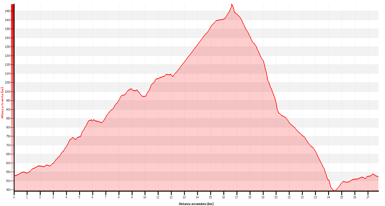 salita: poche difficoltà dal mero punto di vista tecnico in quanto si affrontano forestali e sterrati non particolarmente impegnativi, salvo alcuni tratti caratterizzati da pendenze di rilievo (>15 %) a volte abbinate a fondo sassoso/mosso. Inoltre circa 1/4 di salita si svolge su asfalto con pendenze tra l’8 ed l’11%