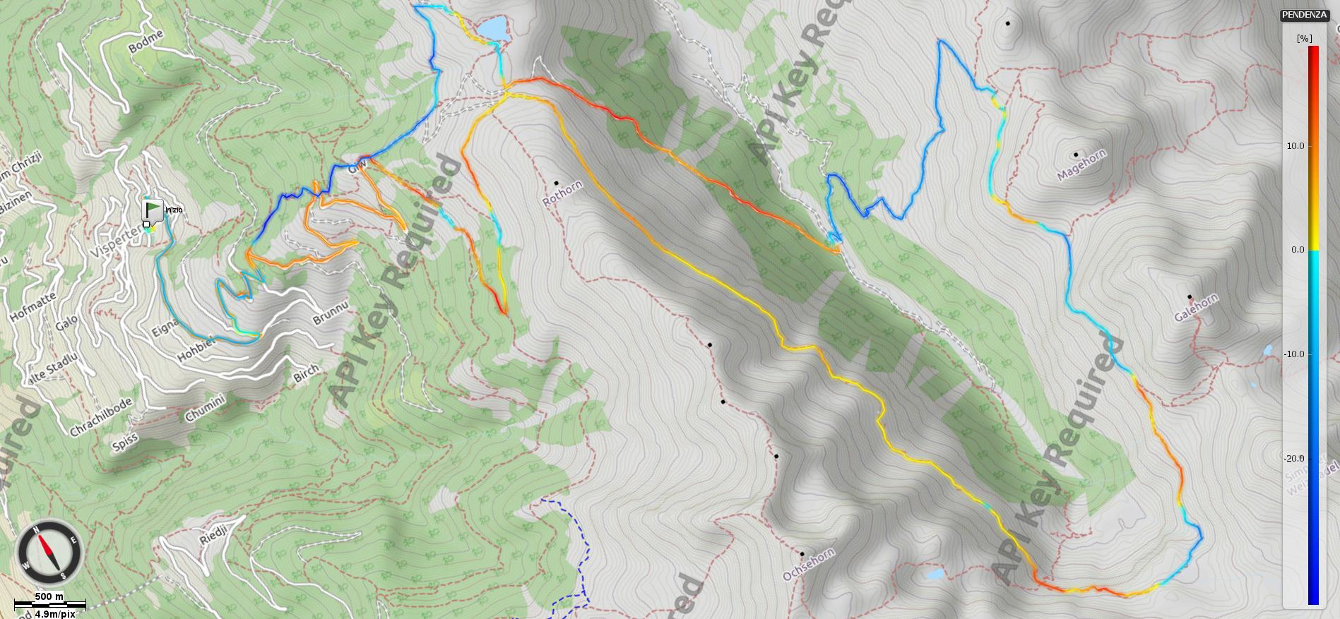 note: il sentiero di andata che percorre la Nanztal è a tratti molto pericoloso per via di alcuni punti esposti accompagnati in taluni momenti da passaggi stretti ed in un paio di circostanze attrezzati con passerelle e/o corda fissa di sicurezza; pertanto la prudenza OBBLIGA nel procedere a mano. Si evidenza inoltre che la traccia caricata differisce nella parte finale dalla traccia effettivamente percorsa: infatti dal Gibidumsee, dopo aver intercettato il bel sentiero proveniente da Giw, originariamente si è proseguito (anzichè a sinistra come indicato in scheda) a destra in direzione nord seguendo il trail “Panorama Weg”. Prima parte di traccia fantastica, molto scorrevole in un paesaggio idilliaco sopratutto se percorsa nel periodo autunnale con macchie rosse di mirtilli a farla da padrona; seconda parte però molto difficile dal punto di vista tecnico in quanto estremamente ripida, complicata e con continui passaggi su roccia anche se erano numerose le tracce di MTB, segno evidentemente di un percorso enduro ben conosciuto dai bikers locali. Dopo molteplici tratti a mano ci si è innestati su un sentiero e tenendone la sinistra, si è percorso un tratto piuttosto pianeggiante all’interno del bosco, non sempre pedalabile per via di passaggi stretti/esposti o ostacoli su percorso, che ci ha portato al villaggio di Bodma percorrendo di fatto un semi-anello sotto al Gibidum e da qui infine un rientro sostanzialmente su asfalto a Visperterminen. Riteniamo che tale tratto, pur se bello nella parte iniziale, non giustifica il tempo e le fatiche spese, da cui la decisione di non riportarlo nella traccia dell’itinerario.