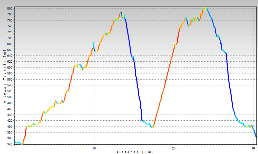salita: l’itinerario si caratterizza per 2 tratte di salita; la prima si svolge in fuoristrada con vari saliscendi e rampe che non superano il 13% su fondo sterrato sdrucciolevole e/o single-track su pietra scivolosa; la seconda tratta (salita a Colma e proseguo) è per un certo verso più semplice in quanto ha luogo su asfalto ma nel tratto intermedio prima dell’arrivo alla frazione sotto il Fenera si raggiungono punte anche al 16%