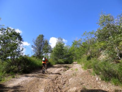 La discesa della superenduro richiede una buona preparazione e una full, mi sono azzardato con una front e il cappottamento è arrivato. Però c’è un percorso alternativo. All’inizio della discesa, riconoscibile da un cartello su un albero con la scritta “Persorso Runner” prendere la single track di sinistra che in breve ti porta in località Rasca, da dove con strada comunale e 800 m si arriva in località Castagnola. Si prosegue fino al cimitero e si prende la sterrata di sinistra, ricollegandosi così al percorso originale. Si evita la discesa superenduro e la noiosissima risalita su asfalto, ovviamente il percorso si accorcia di 9 km.
