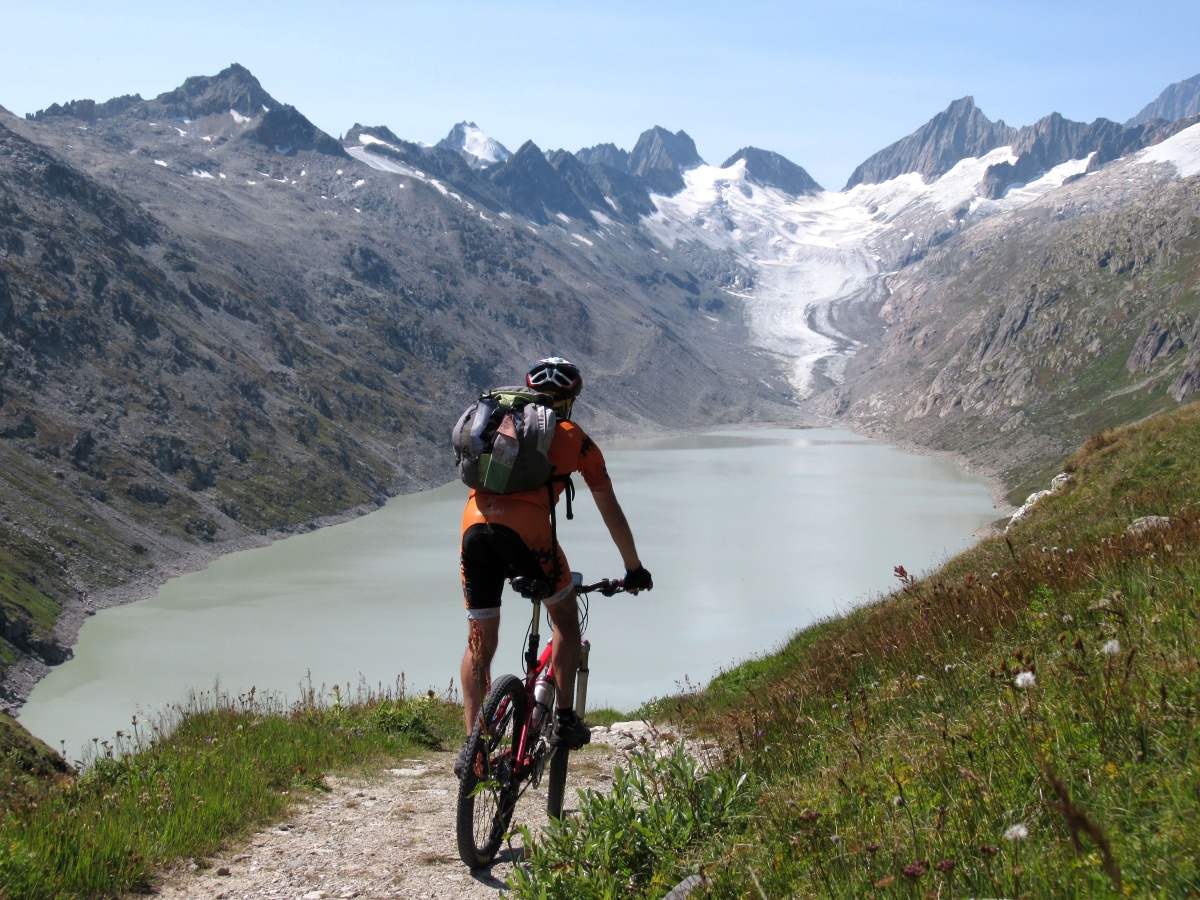 Partenza in Obergesteln, abitato dell’alta regione del Goms (Obergoms), nelle vicinanze dell piccola stazione ferroviaria dove è presente comoda area di libero parcheggio e dove transita la ciclabile del Rodano. Tendendosi il torrente alla propria sinistra, si imbocca quasi subito una bella strada sterrata che attraversa l’ampio pianoro prativo che caratterizza l’Obergoms ed affiancando nella prima parte il locale campo da golf conduce con tranquillità e facilità ad Oberwald (1.370) dopo circa 3 km. La traccia, dopo un brevissimo tratto in asfalto in Oberwald, prosegue costeggiando ancora il Rodano attraversandolo nei pressi di un successivo ponte che permette di imboccare una strada a fondo chiuso che termina nei pressi di alcuni caseggiati presumibilmente utilizzati per il taglio di legname, in prossimità dei quali si entra nel bosco seguendo le indicazioni di sentiero presenti a più riprese. Tale sentiero si sviluppa sostanzialmente in falsopiano all’interno di un bel bosco e solo nella parte finale devia in decisa salita – con alcuni brevissimi passaggi a mano – per incrociare (1.410) la strada asfaltata del Furka. Ora con pendenze assolutamente abbordabili si percorre la trafficata via per circa 2,3 km sino all’Hotel Rhonequelle dove nei pressi dell’attiguo tornante si stacca sulla sinistra una bella forestale (indicazioni MTB “Gämschfax”), non particolarmente impegnativa per fondo (perfetto) e pendenza e che diviene decisamente panoramica man mano che prende quota con scorci addirittura sul massiccio del Mischabel e sul Weisshorn e con posizione di privilegiata vista sul sottostante fondovalle. Pedalando senza la minima difficoltà si giunge a quota 2.100 nei pressi di un bivio con palina segnaletica: qui occorre abbandonare le indicazioni per Gämschfax (le si seguiranno al ritorno – in discesa – quando vi si ritornerà) e proseguire in salita per il Grimselpass; la traccia pur mantenendosi ampia, diviene a fondo più impegnativo per la presenza di tracce d’erba e termina nei pressi di un alpeggio (Nassbode – 2.160). Da qui prosegue una traccia di sentiero, di fatto interamente pedalabile (rari punti di interruzione pedalata a seguito pietre/decisa salita) che conduce in saliscendi (quota massima 2.210) nei pressi del Totesee, relativamente piccolo ma scenografico lago alpino posto nei pressi del Grimselpass. Il sentiero costeggia la sinistra del lago con qualche breve passaggio difficoltoso per via dell’attraversamento di alcune pietraie ed incrocia l’asfalto in corrispondenza del Passo (2.165), con vista sul sottostante Grimselsee. Questa strada (Panoramastrasse Oberaar) deve ora essere seguita in salita seguendo le molteplici indicazioni di sentiero presenti: percorso altamente scenografico e maestoso; man mano che si procede infatti, spuntano gli imponenti 4.000 dell’Oberland (Fiescherhorn, Lauteraarhorn, Finsteraarhorn) ed in primo piano domina la scena l’Unteraargletscher che termina nel sottostante Grimselsee (quest’ultimo ci accompagna sotto di noi per gran parte di questo tratto di salita). Dopo poco più di 3 km a quota 2.300 si abbandona l’asfalto deviando a sinistra su strada sterrata (presente sbarra per il traffico auto) che sale con pendenze a tratti decisamente impegnative costeggiando il lago alpino Triebtenseewli e terminando la sua corsa presso l’alpeggio di Baregg (2.440); di fronte a noi un panorama fantastico: l’Oberaarsee visto dall’alto con l’Oberaargletscher, l’Oberaarrothhorn e l’Oberaarhorn a definirne la testa e, non da ultimo, la parte più estrema della vetta del Finsteraarhorn. Ovviamente la meta di giornata costituisce anche il punto ottimale per riprendere le forze dopo il lungo sforzo compiuto (di fatto 17 km di salita escludendo il falsopiano iniziale alla partenza): ora inizia la via del ritorno seguendo il sentiero che prosegue dalla sterrata che ci ha portato a Baregg. La traccia lascia inizialmente ben sperare in termini di ciclabilità nei primi metri di discesa, poi però diviene troppo esposta e sopratutto troppo a gradini per pensare di affrontarla in sicurezza per cui con un breve tratto a mano di 5 minuti si guadagna la sottostante strada asfaltata proveniente dall’Oberaarsee e la si segue in discesa superando il bivio per il Triebtenseewli, ricalcando da qui in poi pertanto la traccia dell’andata. Il percorso di rientro si accomuna a quello di andata sino alla sopracitata palina segnaletica posta a quota 2.100 superato Nassbode : da qui in poi seguiranno dapprima le indicazioni MTB per Gämschfax lungo una bella e facile traccia di sentiero fino a quota 2.050 ed in seguito le indicazioni MTB per Obergesteln su semplice forestale che conduce alle porte del paese in circa 20 minuti di assoluto relax e ampi panorami