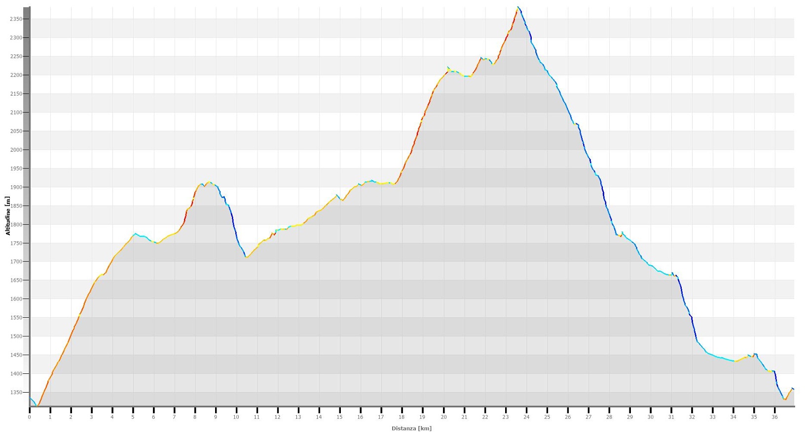 salita: sino ad Anvéuda le pendenze sono quasi costantemente nell’ordine del 12-14% ma si svolgono su tranquilla stradina in asfalto; il tratto successivo da Dötra a Croce Portera superato il Piano del Gualdo è, come sopra già indicato, decisamente impegnativo in quanto molto ripido su fondo non buono (analogo ripido si incontrerebbe salendo subito dalla Capanna Dötra per cui non ci sono alternative valide per risparmiare energie). Particolarmente impegnativa la salita al Passo dell’Uomo nonostante rispetto al passato sia stata aggiustata con pendenze che non scendono MAI sotto il 14-15% e punte al 18-20%; infine l’ultimo tratto di salita di giornata è per il Passo del Sole: le pendenze non sono significative (difficilmente oltre il 10-12%) ma il fondo su sentiero è spesso sassoso e dopo aver affrontato le precedenti salite le energie sono al minimo con tutte le difficoltà del caso