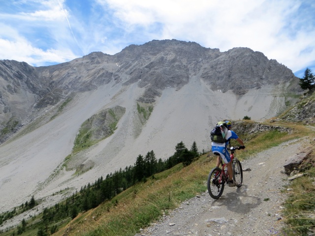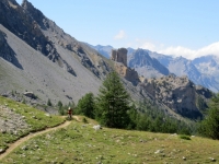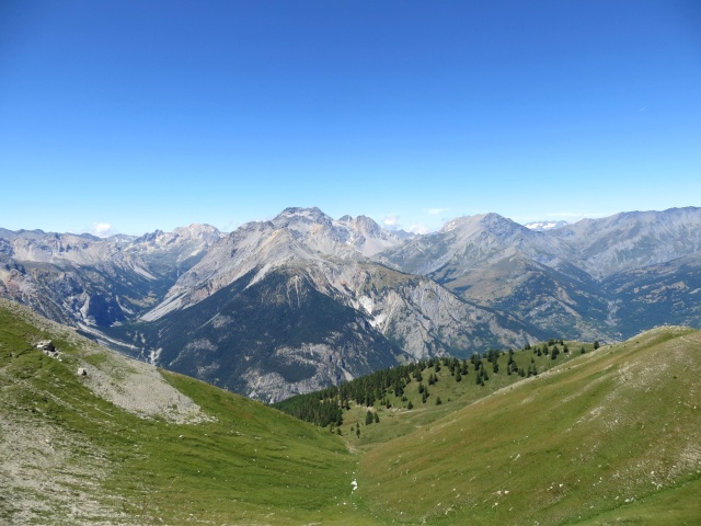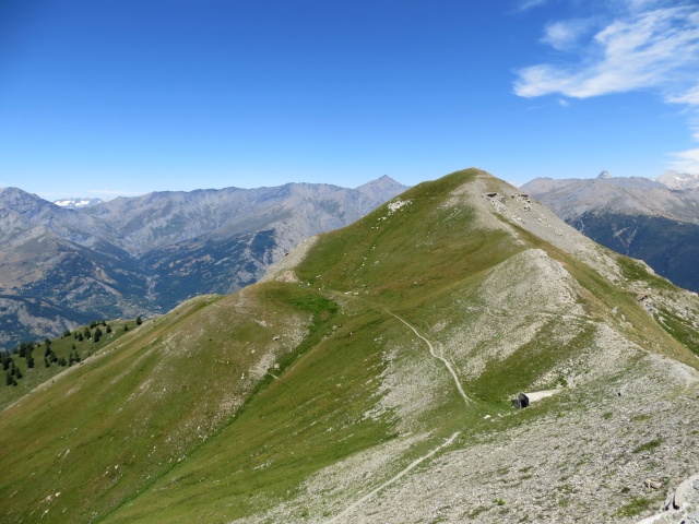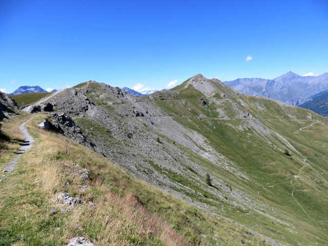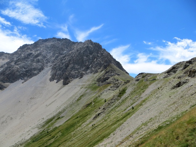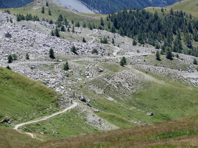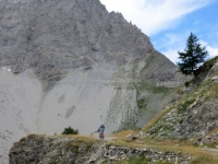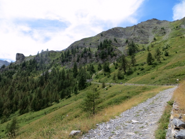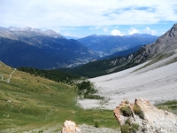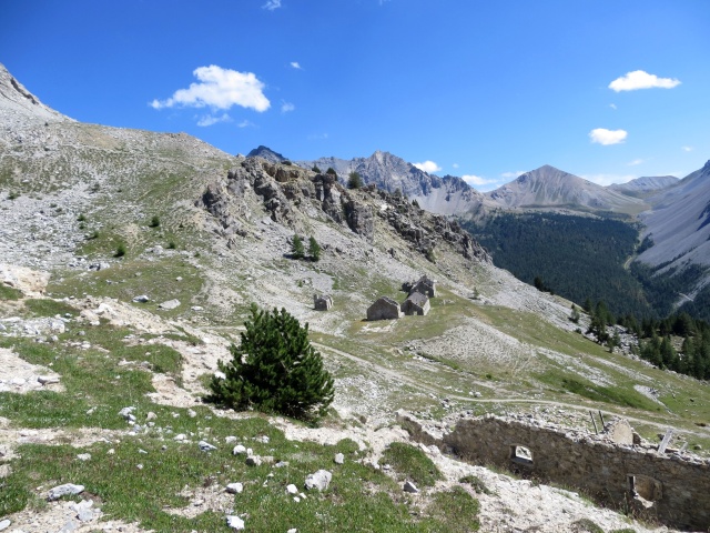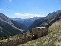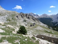 Lungo il sentiero di discesa in direzione del Col des Acles, vista sui baraccamenti militari sovrastanti il colle